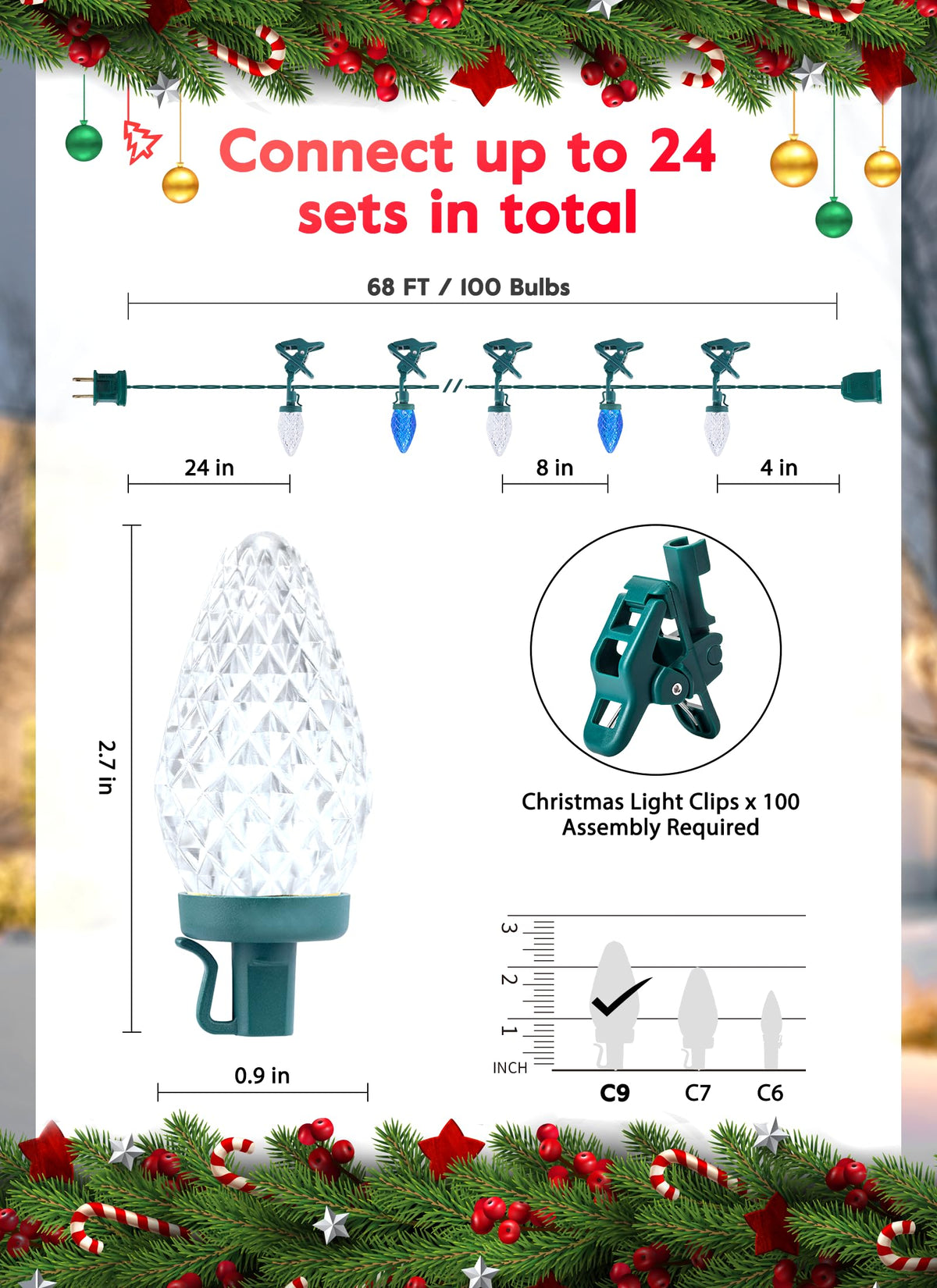 Q: Can the C9 string lights be connected to other sets?A: Yes, the C9 string lights are connectable, allowing you to connect up to twenty-four sets end to end.