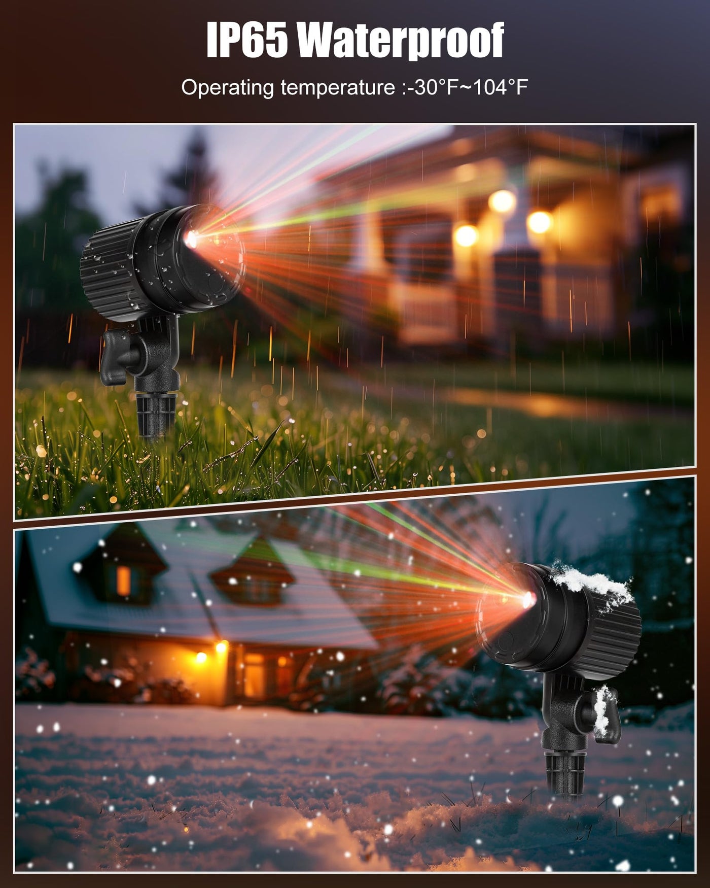 Q: Is the Christmas lights laser projector waterproof?A: Yes, the Christmas lights laser projector has an IP65 waterproof rating, making it suitable for outdoor use in rain and snow, ensuring reliable performance during various weather conditions.