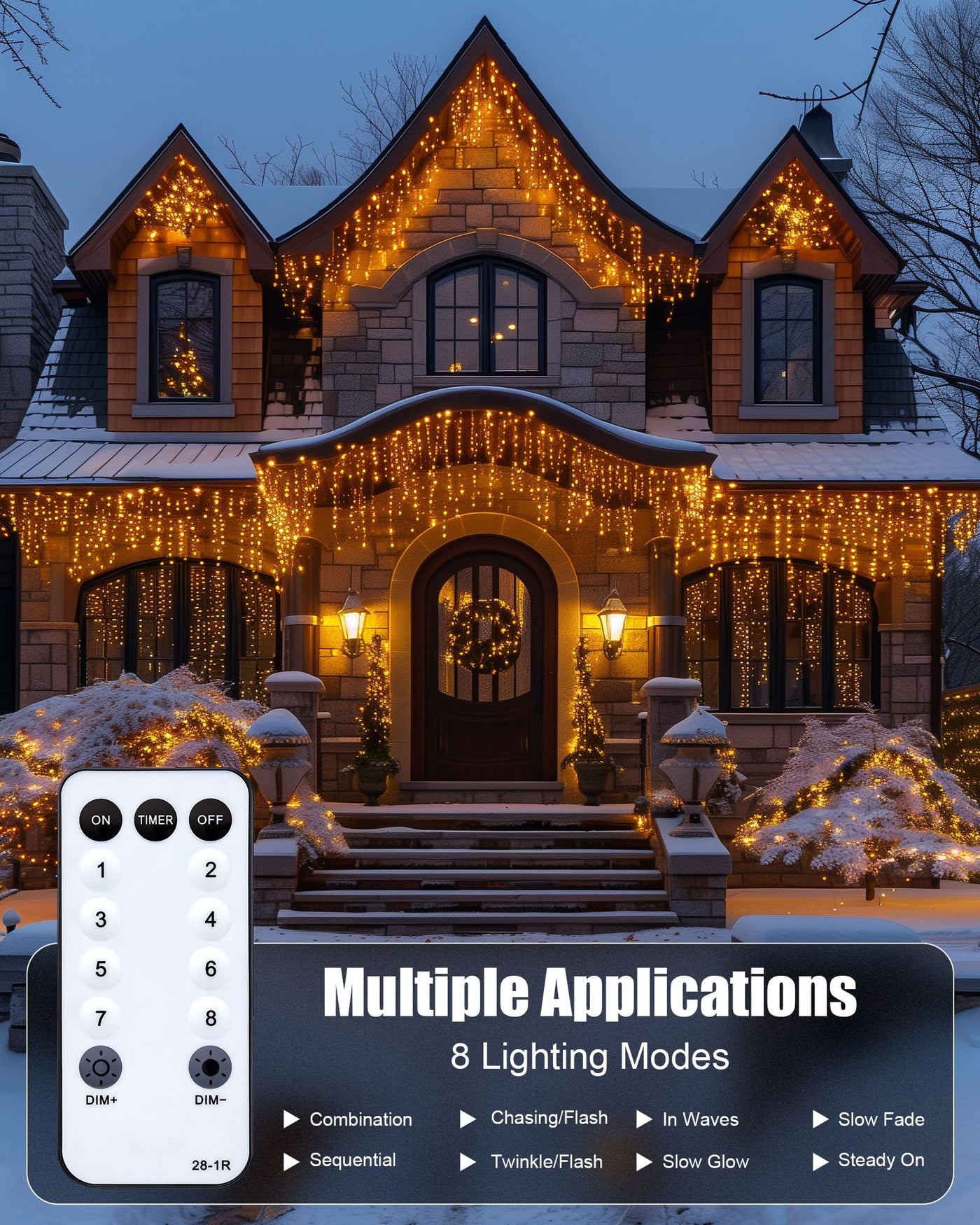 8 Lighting Modes: These Led Icicle Christmas Lights Emit A Warm Glow At Night, With 8 Light Modes To Choose From. Ip44 Waterproof: The Christmas Led Lights Outdoor Are Perfect For Any Weather Conditions. These House Christmas Lights Outdoor Providing A Reliable And Beautiful Glow Whether Facing Rain, Snow, Or Wind. Ideal For Christmas House Lights. How To Install? These Outside Christmas Lights For House Are Lightweight And Neatly Packed, Making Them Easy To Unpack Without Creating A Big Tangle. For Installation, Locate The Main Line Of The Warm White Icicle Lights. Use Small Hooks Or Cable Ties, Or Simply Wrap Them Around The Desired Location. Then, Untie The Remaining Vertical Lines To Avoid Entanglement During Installation.Specifications:Lighted Length: 66 Feet Led Bulb Quantity: 736Bulb Spacing: 4 Incheslead Cord Length: 9.8 Feetremote Control Working Range: 16.4 Feetcable Color: Transparentip Rating: Ip44 Waterproofpackage Included: Icicle Lights With Ac Adapter 1 X Remote Control