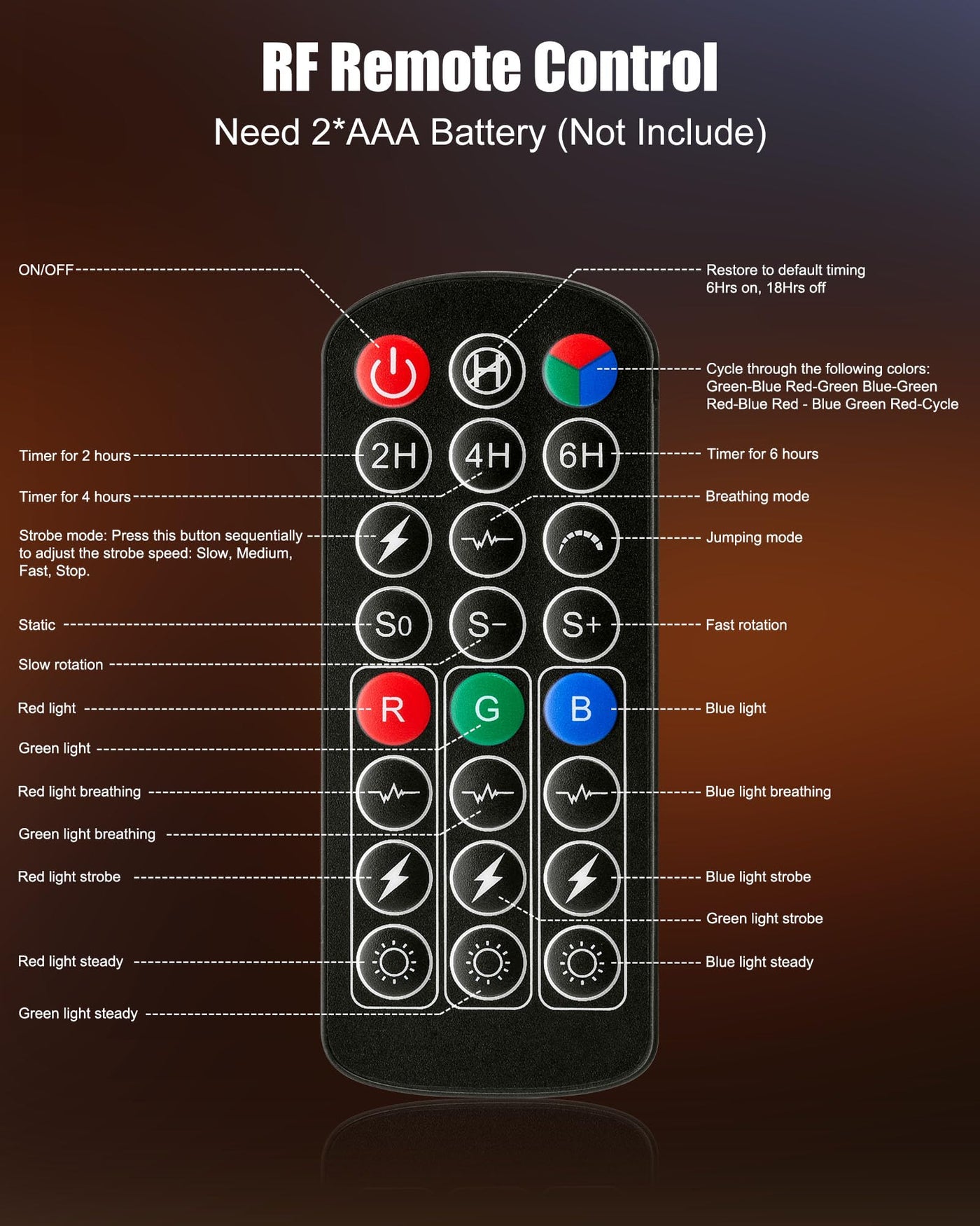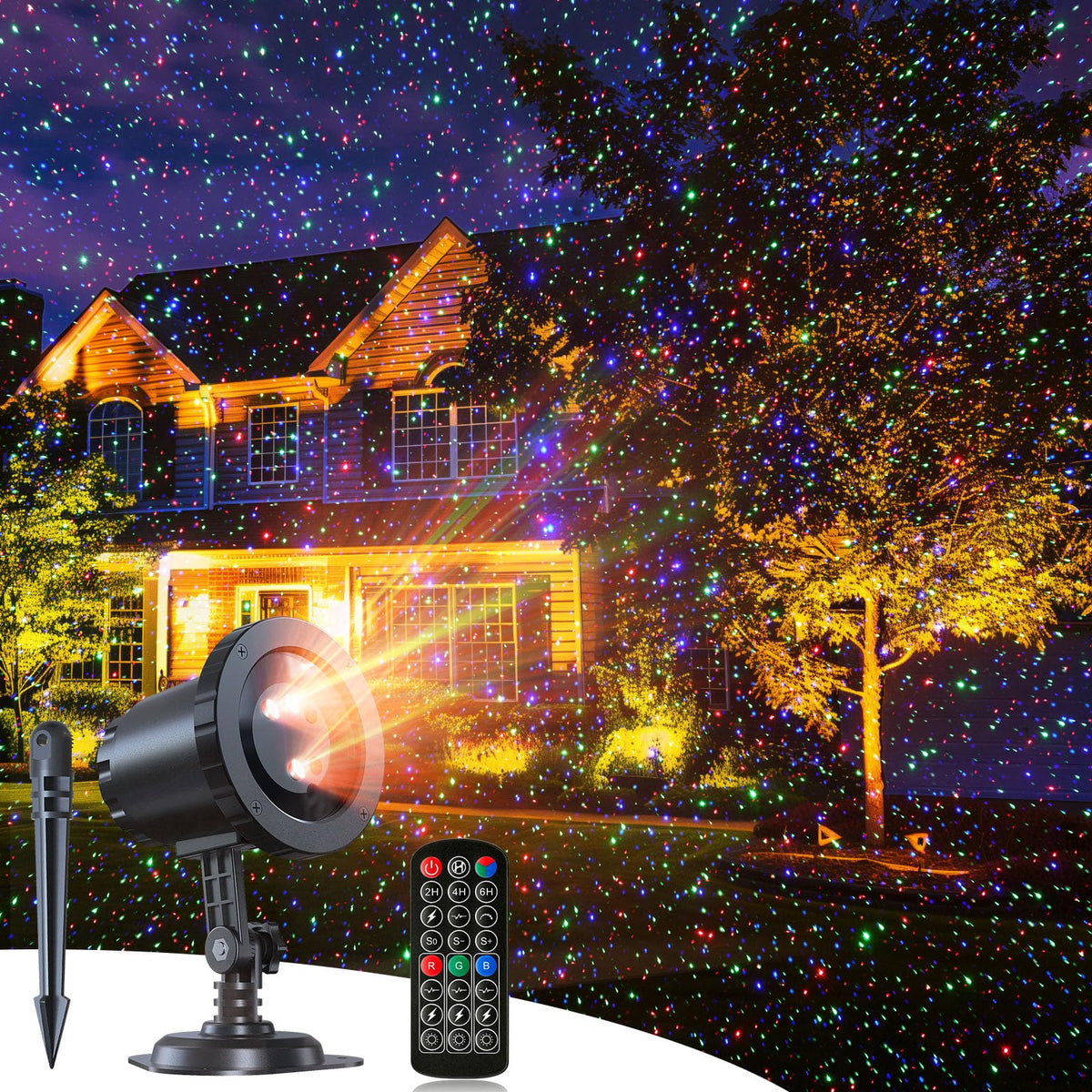 Q: How does the remote control work for this laser projector?A: The included RF remote control allows users to operate the laser light projector from a distance. It enables functions such as turning the projector on and off, selecting colors, adjusting rotation speed and flash frequency, and setting timers for two, four, or six hours.