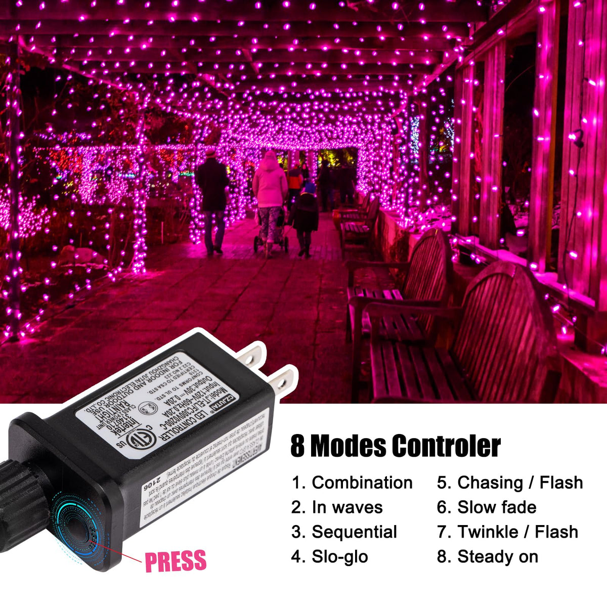 Q: What are the lighting modes available for these fairy lights?A: These fairy lights offer eight lighting modes: combination, in waves, sequential, slow glow, chasing/flash, slow fade, twinkle/flash, and steady on.