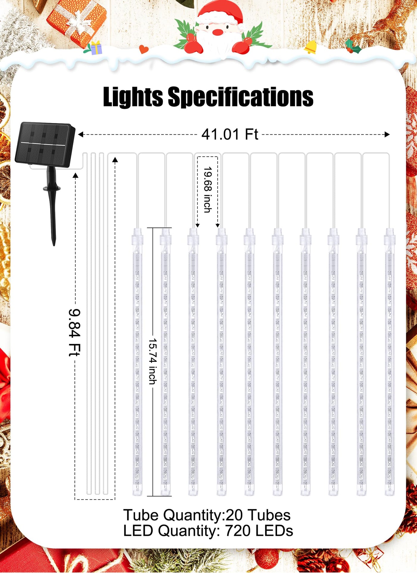 Q: What is the length and number of tubes in the Minetom Solar Meteor Shower Lights?A: The Minetom Solar Meteor Shower Lights feature twenty tubes, each measuring sixteen inches in length.