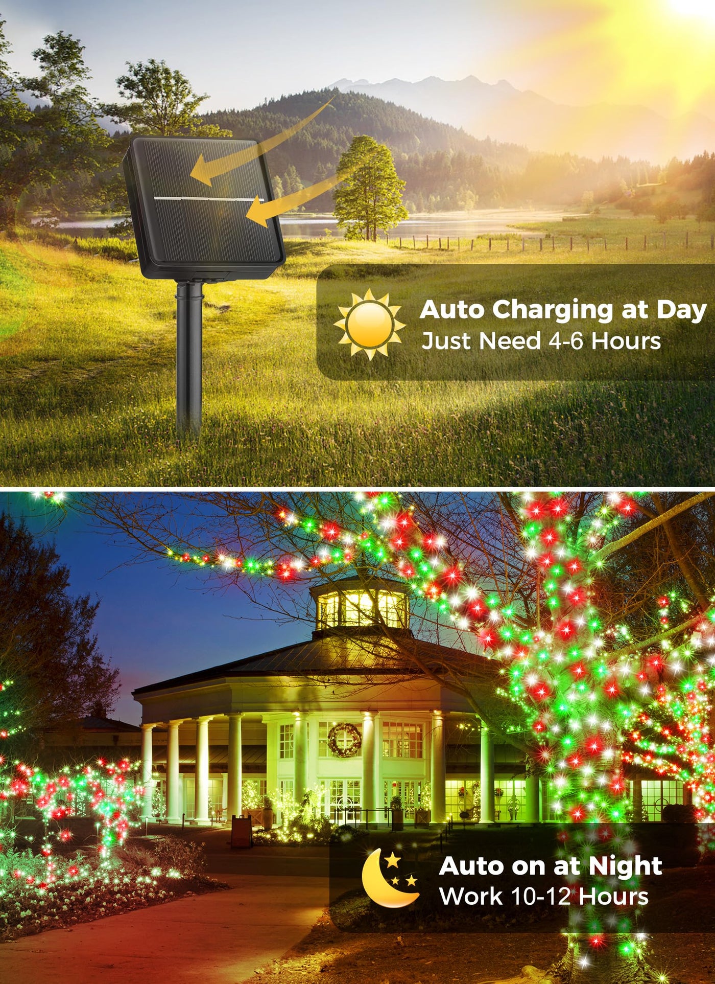 Q: How long do the Minetom Solar Christmas Lights last on a full charge?A: The Minetom Solar Christmas Lights can last for more than 10 hours of lighting at night after being fully charged for 4-6 hours in direct sunlight during the day.