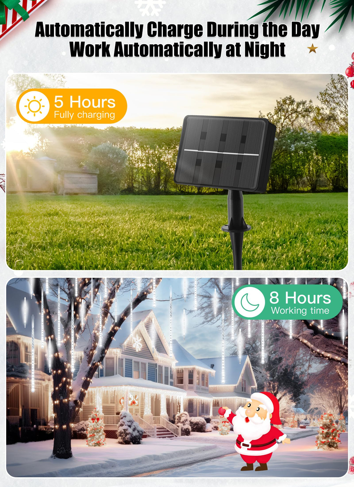 Q: How do the Minetom Solar Meteor Shower Icicle Lights work?A: The Minetom Solar Meteor Shower Icicle Lights operate using solar power, eliminating the need for batteries or electrical outlets. They come with a solar panel that charges in sunlight for 4-6 hours, providing up to 8-10 hours of illumination at night.
