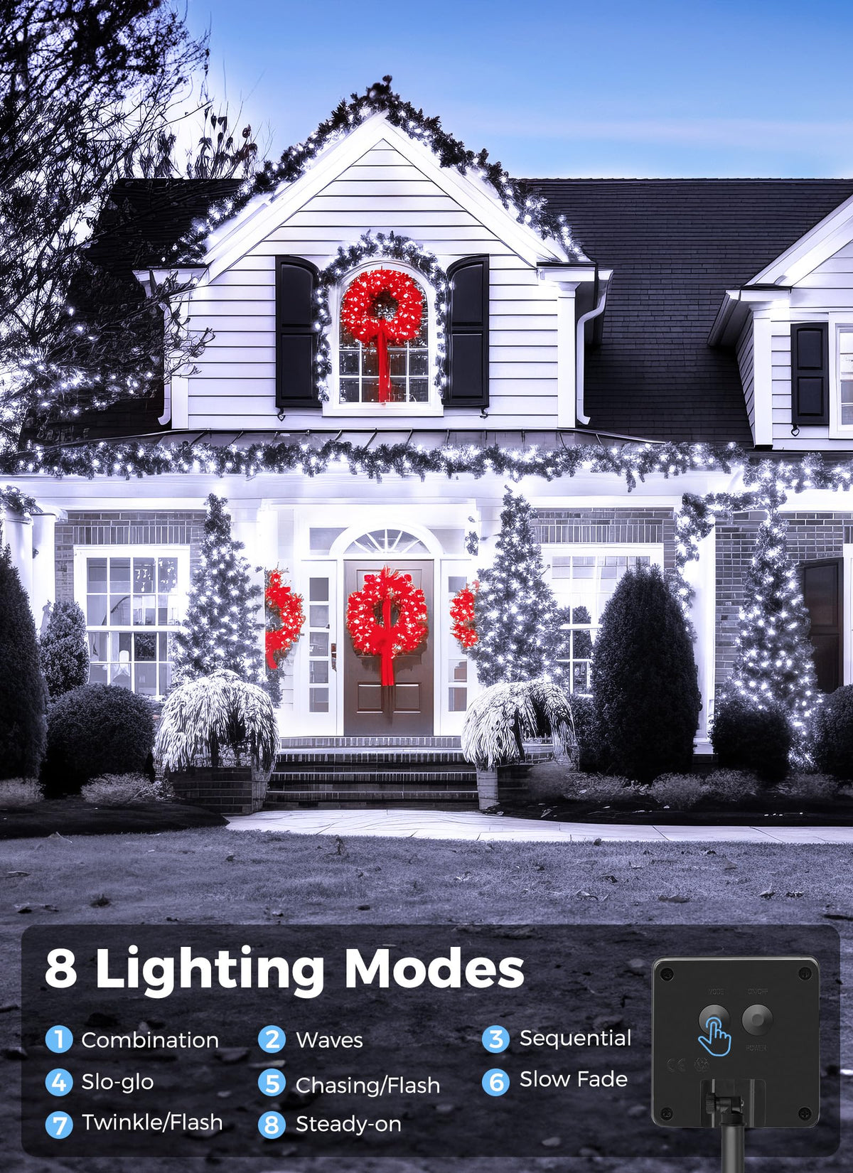 8 Lighting Modes: Choose from various settings including Combination, Waves, Sequential, Slo-glo, Chasing/Flash, Slow Fade, Twinkle/Flash, and Steady-on to create the perfect atmosphere.