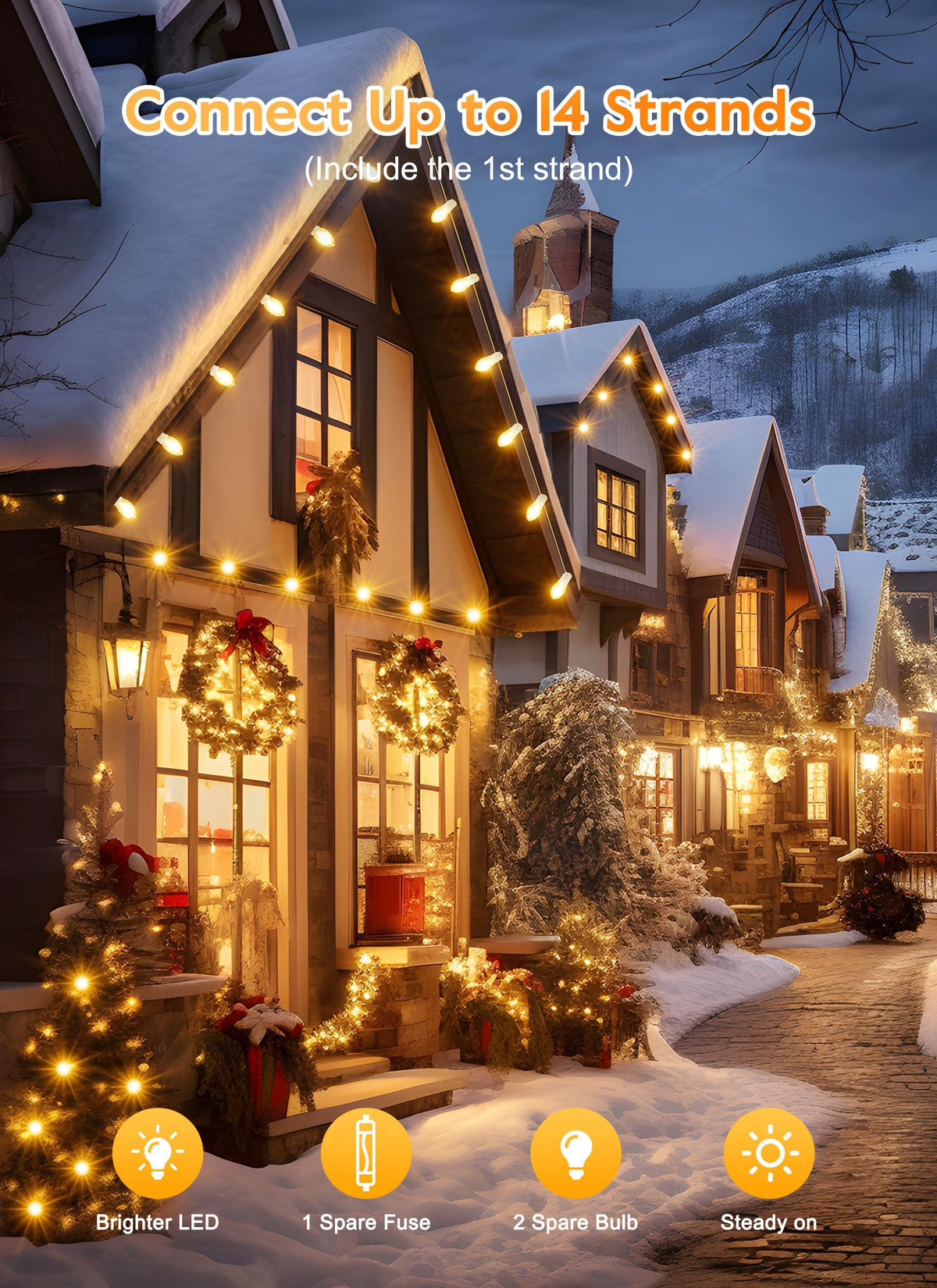 Q: Can these Christmas lights be connected to other strands?A: Yes, the lights are end-to-end connectable, allowing you to connect up to thirteen strands together for extended coverage.