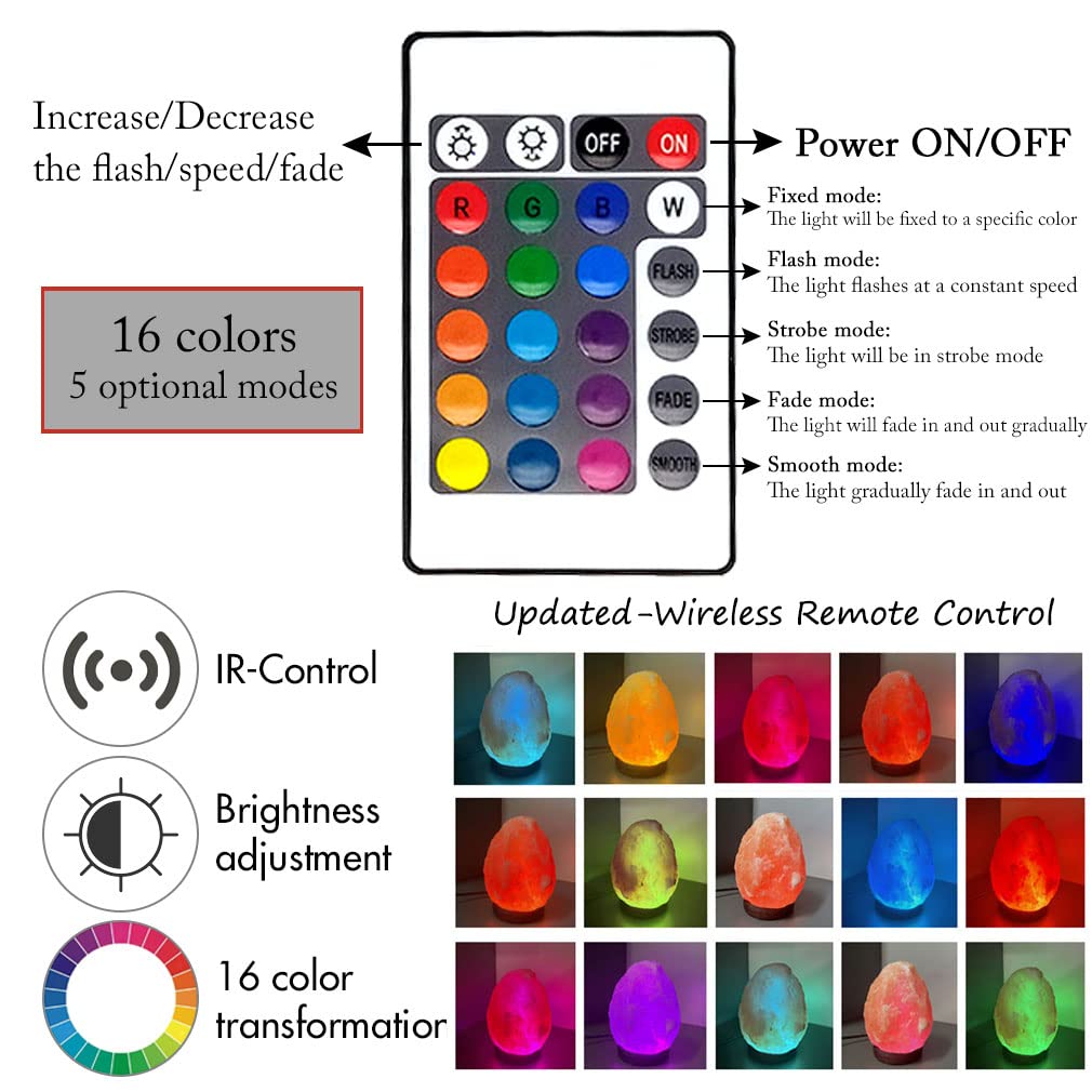 Q: How do I use the remote control for the salt lamp?A: The updated wireless remote control allows you to easily switch between 16 colors, adjust brightness, and choose from 5 light patterns including static and fading options. Simply point the remote at the lamp and select your desired setting.