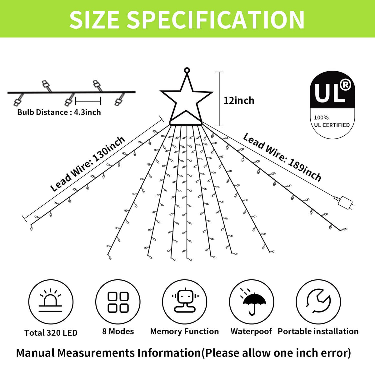 Specifications: - **LED Color**: Red + Green - **Material**: Copper + PVC - **Power Source**: Plug-in electric - **LED Quantity**: 317 - **Total Strands of Lights**: 9 strands - **Waterproof Level**: IP44 - **Lighting Modes**: 8 - **Total Number of Bulbs on Each Strand**: 32 LEDs - **Space Between Each Bulb**: 0.36ft - **Star Tree Topper Lighted with**: 29 LEDs - **Size**: Star Diameter 32cm/12.6in, Each String Light Length 3.5m/11.5ft, Plug Cable Length 5m/16.4ft