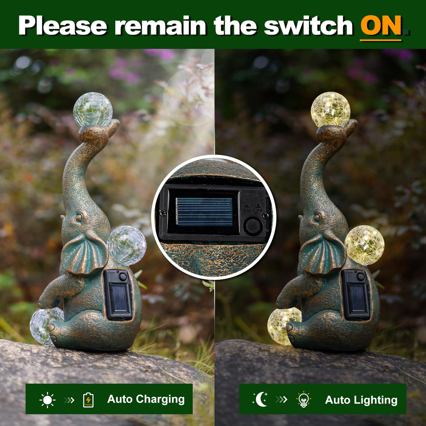 Q: How does the solar lighting feature work for the MININOVA Garden Decor Elephant?A: The MININOVA Garden Decor Elephant features an auto on/off solar-powered lighting system. Simply turn the switch ON and place the statue in direct sunlight for 6-8 hours. It will charge during the day and automatically light up for 8-10 hours at night, creating a beautiful decorative glow.