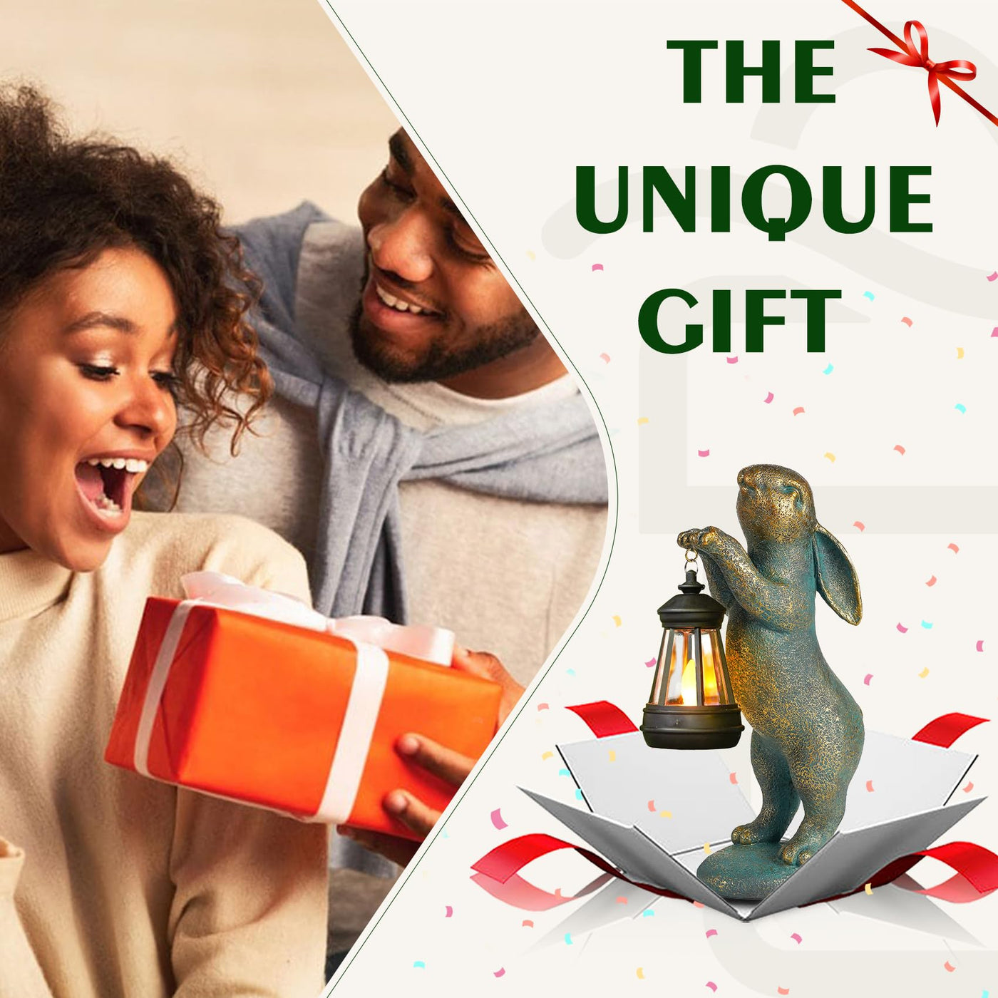The Bronze Rabbit Statues With Lantern: The Bronze Rabbit Statues Hold A Solar Lantern, Which Casts A Warm And Welcoming Glow. The Light Mimics A Vivid Small Flame And Flashes In The Breeze. As The Symbol Of Good Luck, Joy, And Prosperity, The Rabbit Figurines Are Ideal For Creating A Warm Atmosphere In The Patio, Yard, And Porch. Auto On/Off Solar-Powered Lights: No Setup Required! Just Remain The Switch On, Place The Statues In Sunlight For 6-8 Hours Of Charging, It Will Light Up Automatically In Night For 8-10 Hours. High-Quality Resin Statue: The Hand-Painted Uv Resistant Coating & Solar Panel Are Waterproof And Can Be Used On Rainy Days Without Worrying About The Figurine Discolored. Perfect Size: Size Of The Rabbit Lantern Statues Art Is 3.2''(W) X 6.7''(D) X 11.4''(H).