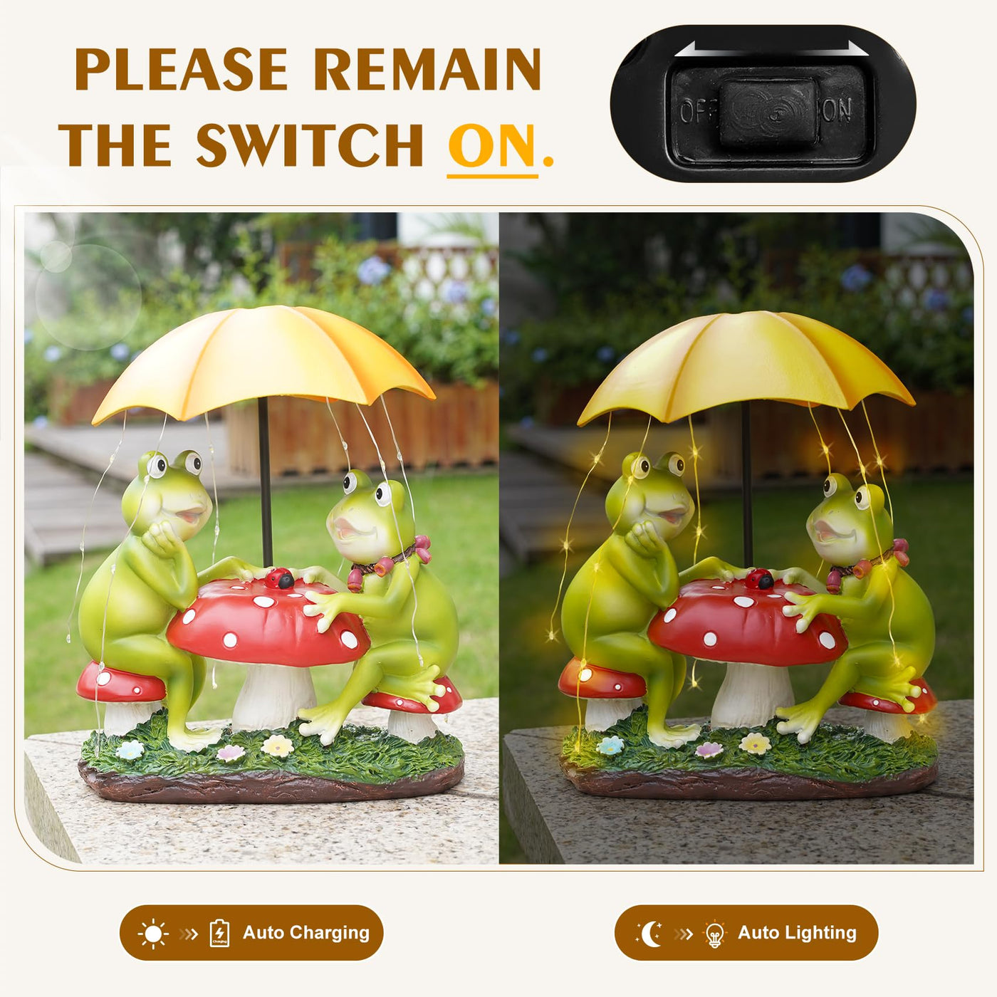Q: How does the solar charging feature work for the MININOVA frog statue?A: The solar-powered feature of the MININOVA frog statue allows it to charge during the day. Simply turn on the switch and place the statue in direct sunlight for 6-8 hours. It will automatically light up at night for 8-10 hours, thanks to the stored solar energy.