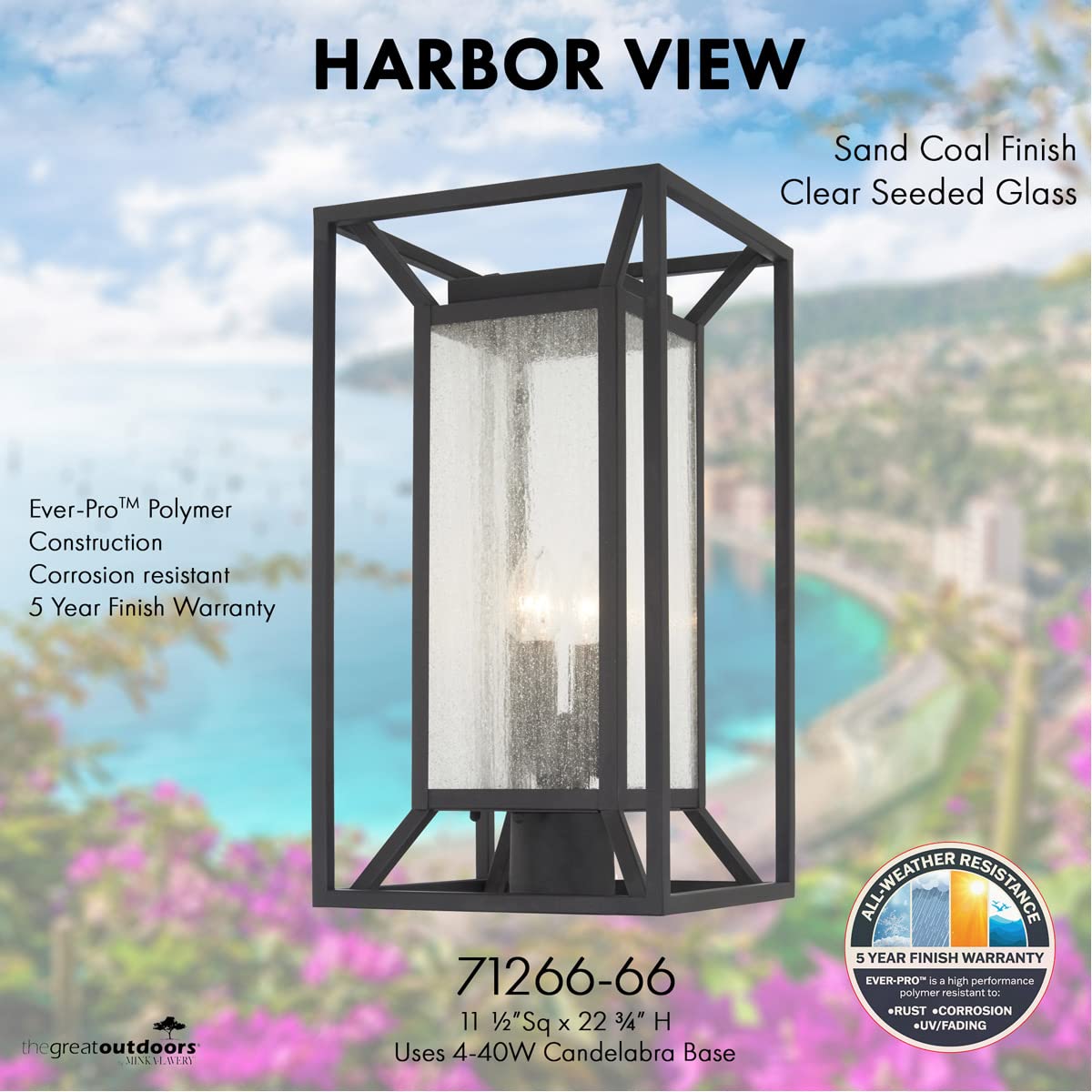 Q: What material is the Minka Lavery Harbor View Post Light made of?A: The Minka Lavery Harbor View Post Light is made of high-quality polymer, featuring a sand coal finish and clear seeded glass for an elegant outdoor appearance.
