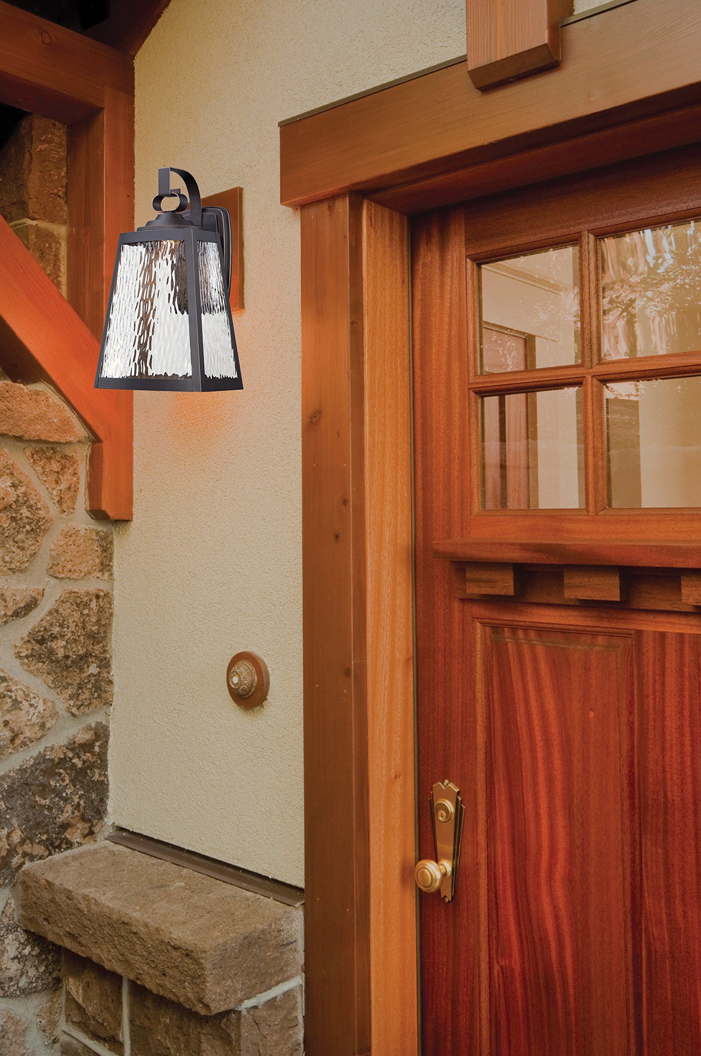 Q: What materials are used in the construction of this exterior wall lantern?A: This outdoor wall light is made of durable aluminum with an oil rubbed bronze finish and features clear water glass for added elegance.