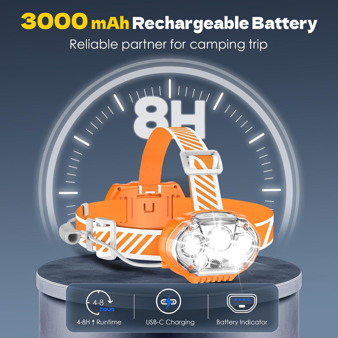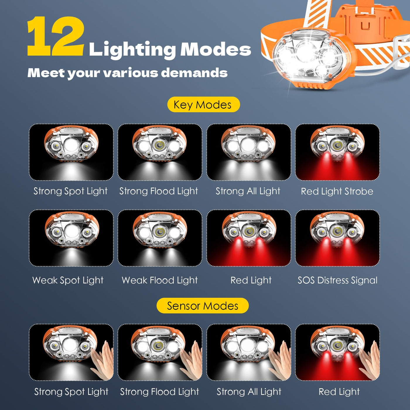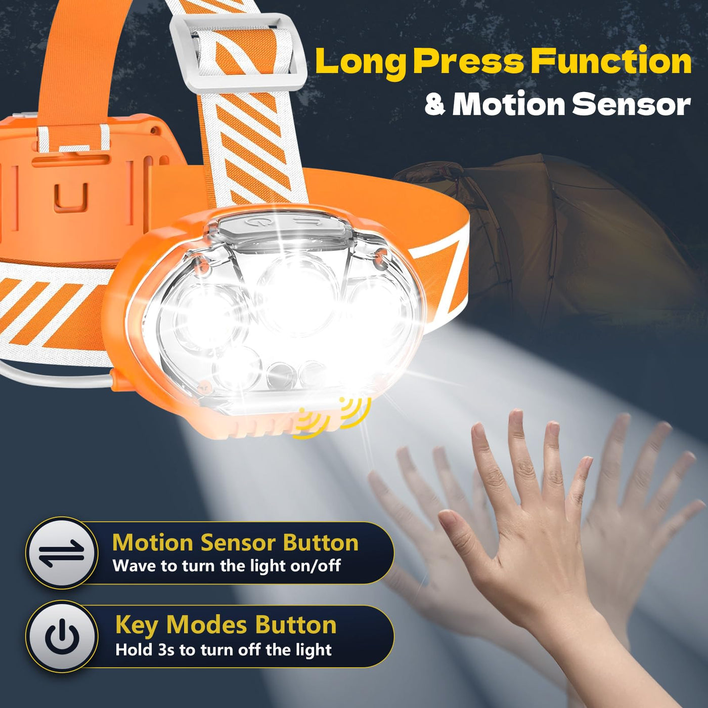 Why choose MIOISY headlamp? MIOISY has been focusing on the research and producing headlamps for several years. We collected users voices to do some functional updates, and design this new MIOISY rechargeable headlamp. 1.8 Working Modes. Meet your different daily use. 2.Motion Sensor. Control light more flexibly by waving your hand. 3.Rechargeable. Up to 1,000 cycles of charging. No need to buy expensive batteries repeatedly. 4. Precise Performance. Achieves 10,000 hours of lifetime. 5. Battery Indicator. Easily grasp battery level. 6.Lightweight. The head weighs only 6.5 OZ. Keep away from heaviness and fatigue. 7.Adjustable and Comfortable design. Tiltable head and elastic headband will fit your head perfectly. 8.IPX4 Waterproof. Easily resist rain/water splashes. 9.Worry-free Help. We provide professional help to solve all your problems. Mode control 1. 4 Core LED Modes ?First click, main beam. ?Second click, side beam. ?Third click, all beam beam. ?Fourth click, all beam strobe ?Fifth click, turn off the power. 2. 4 COB Modes ?First click, strong beam. ?Second click, weak beam. ?Third click, red beam. ?Fourth click, SOS red strobe. ?Fifth click, turn off the power. Packing List 1x Headlamp 1x Type-C USB Cable