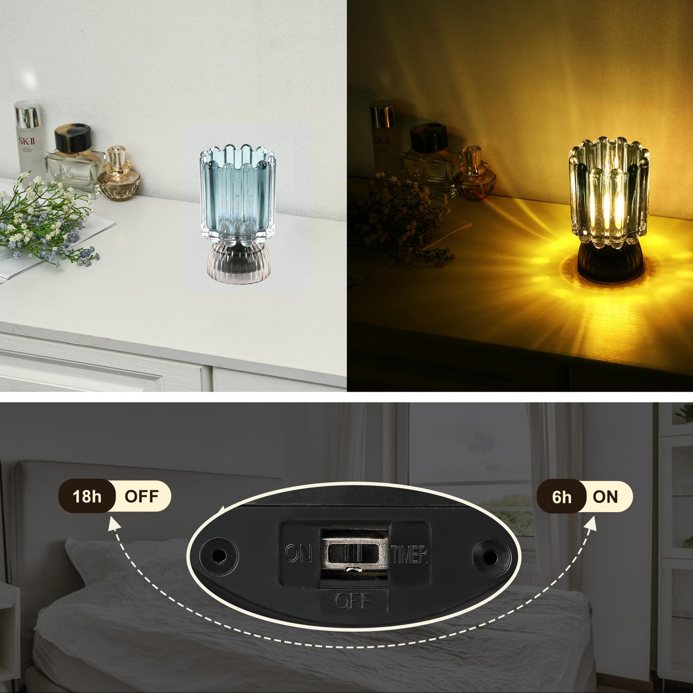 Q: What is the unique design of the lamp?A: The lamp features a hand-blown glass design in a smoke blue color, combining rustic charm with modern minimalism. Its weighted base ensures stability on various surfaces, making it not only functional but also a stylish décor piece for any setting.