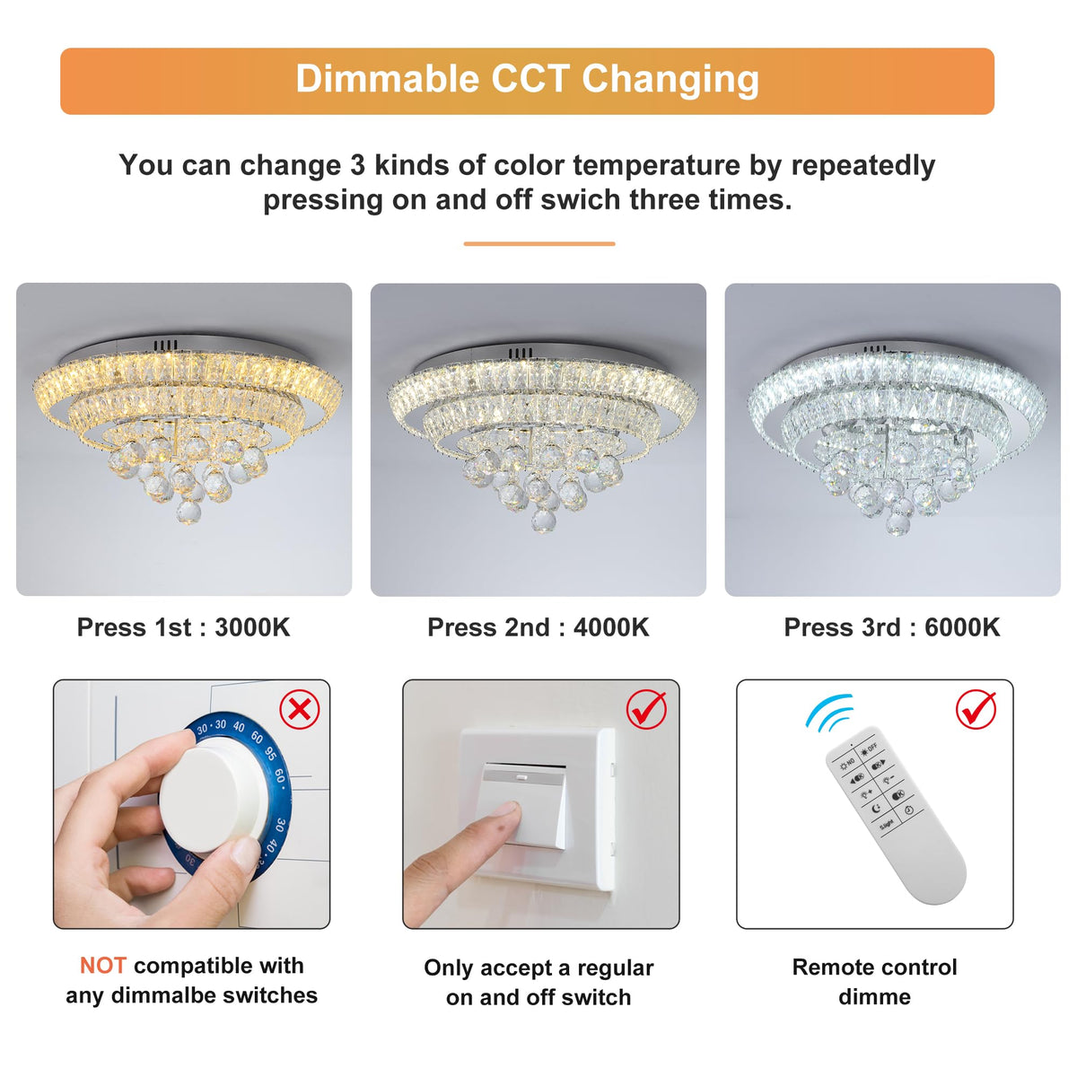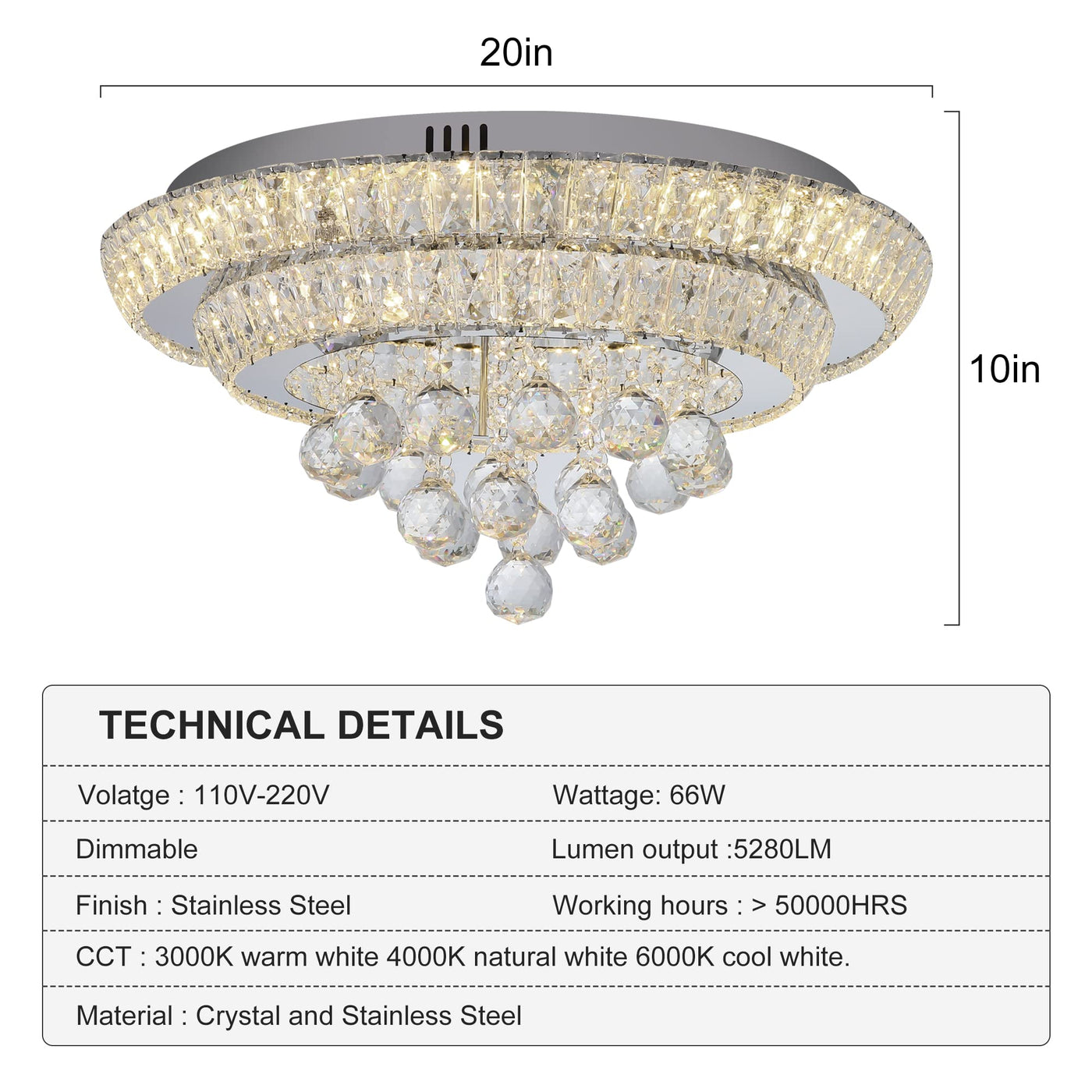 Modern and Elegant Design, crystals are clear and twinkling will gives off a soft and warm light, which is rather friendly to the eyes, caring for you and your family. crystal ceiling lamp makes your life more gorgeous and exquisite,This ceiling chandelier is suitable for indoor use, such as living room, bedroom, dining room, kitchen, etc. Chandelier Details: Chandelier size: 20'' x 20'' x 10''H, Canopy size: 20'' x 20'' x 1.57''H Color: Chrome Material: K9 Crystal+Stainless Steel Light Source Type: LED SMD Bulb Voltage: 110V-220V Wattage: 33W*3 Light Source Color (Dimmable): Warm White( 3000K) Neutral White(4000K) Cool White (6000K) Recommended area: 10-15?. Easy Installation: All parts assembled, just install the ceiling plate will be ok. This contemporary square ceiling chandelier light fixture with simple and luxury and modern look, it will be never out of date, the ceiling light fixture uses high-quality materials, K9 crystals and stainless steel, makes the light looks glamorous and classy and enhance your home decor; When you turn on the light,3 color temperature replacement, brings different ambiance in your home, warm and romantic, looks very luxurious!