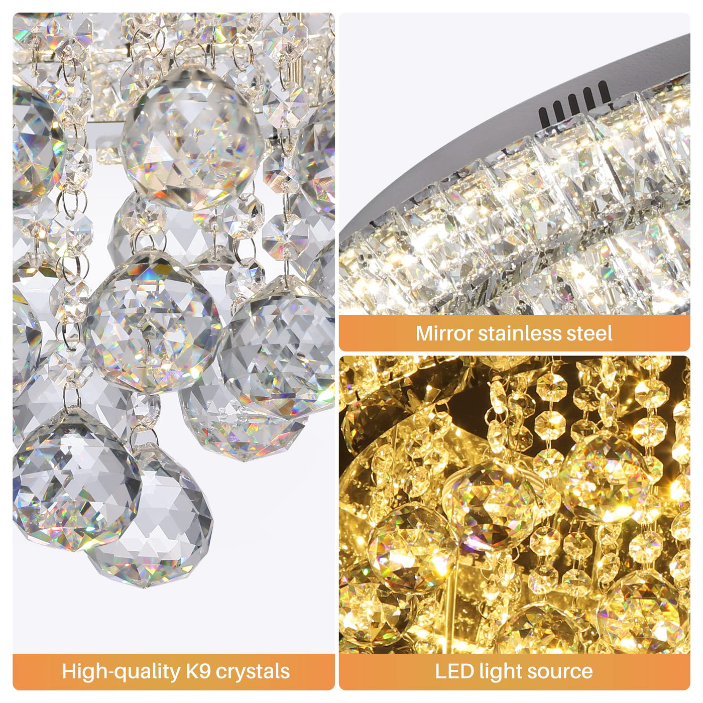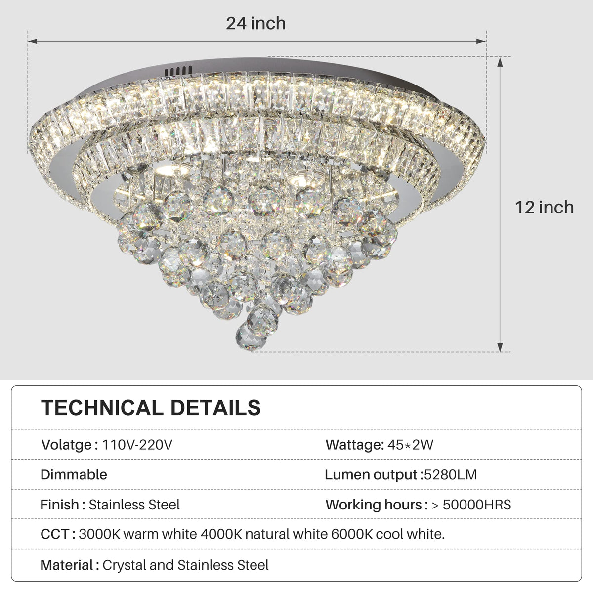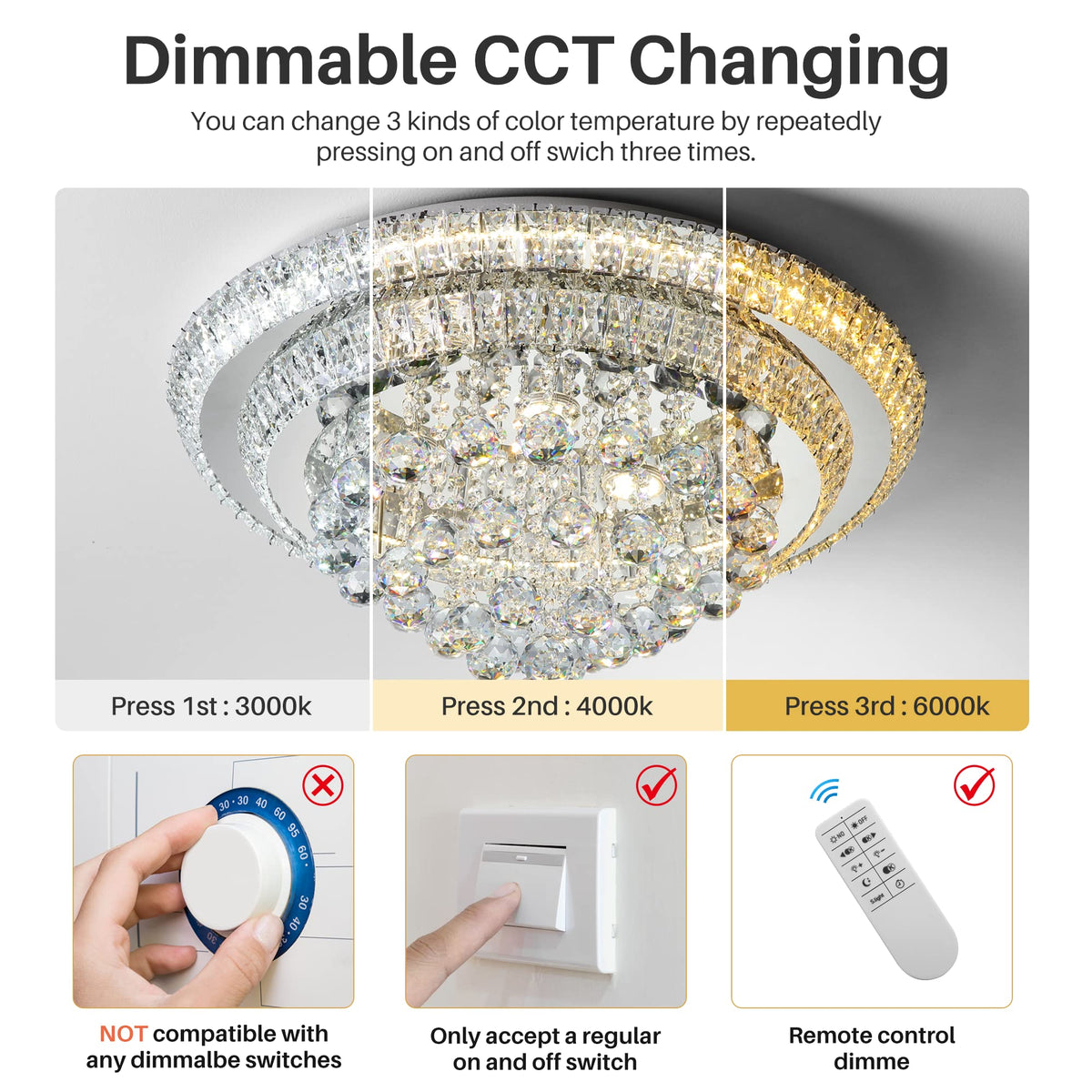 Modern And Elegant Design, Crystals Are Clear And Twinkling Will Gives Off A Soft And Warm Light, Which Is Rather Friendly To The Eyes, Caring For You And Your Family. Crystal Ceiling Lamp Makes Your Life More Gorgeous And Exquisite,This Ceiling Chandelier Is Suitable For Indoor Use, Such As Living Room, Bedroom, Dining Room, Kitchen, Etc. Chandelier Details: Chandelier Size: 24'' X 24'' X 10''H, Canopy Size: 24'' X 24'' X 1.57''H Color: Chrome Material: K9 Crystal+Stainless Steel Light Source Type: Led Smd Bulb Voltage: 110V-220V Wattage: 33W*3 Light Source Color (Dimmable): Warm White( 3000K) Neutral White(4000K) Cool White (6000K) Recommended Area: 10-15?. Easy Installation: All Parts Assembled, Just Install The Ceiling Plate Will Be Ok. This Contemporary Square Ceiling Chandelier Light Fixture With Simple And Luxury And Modern Look, It Will Be Never Out Of Date, The Ceiling Light Fixture Uses High-Quality Materials, K9 Crystals And Stainless Steel, Makes The Light Looks Glamorous And Classy And Enhance Your Home Decor; When You Turn On The Light,3 Color Temperature Replacement, Brings Different Ambiance In Your Home, Warm And Romantic, Looks Very Luxurious!
