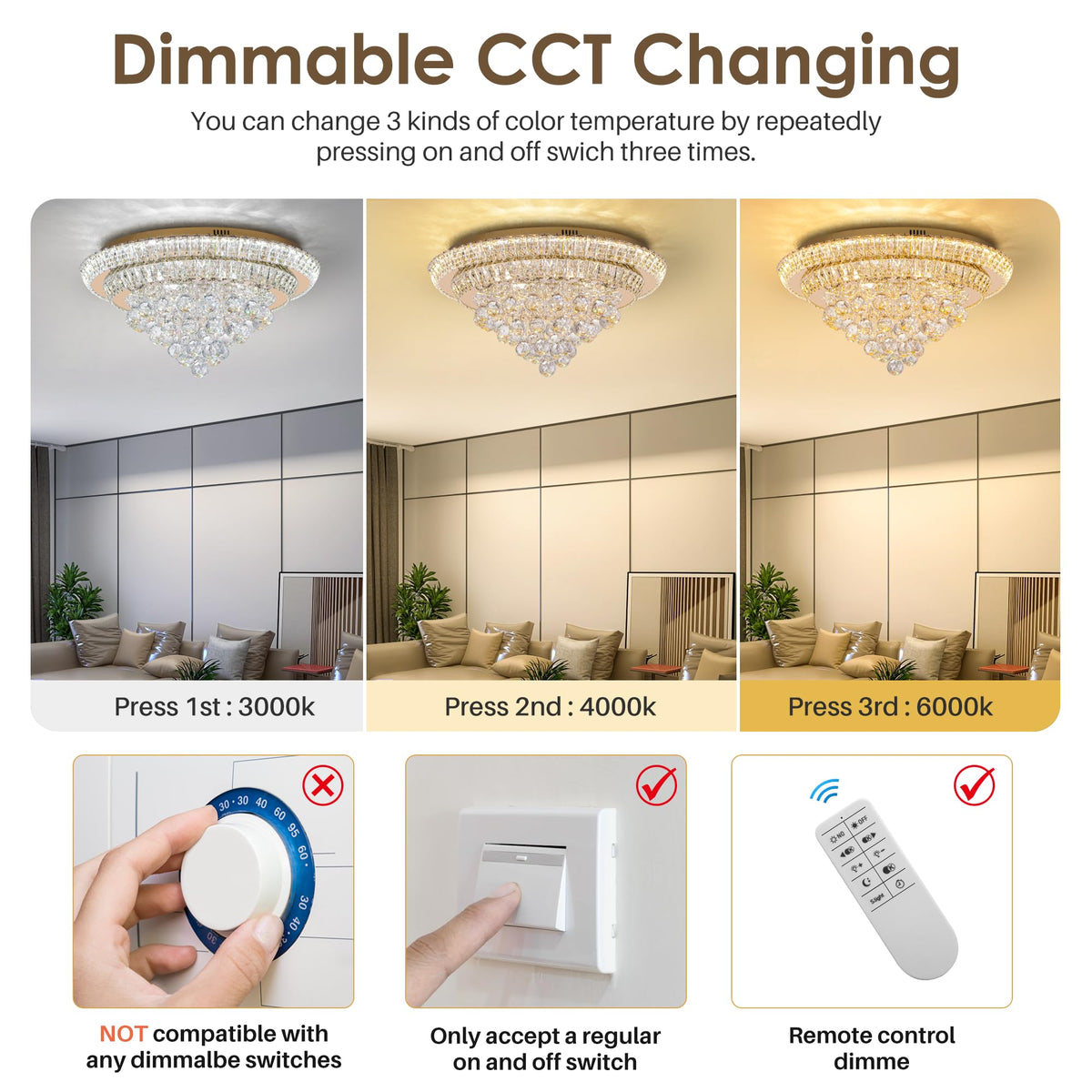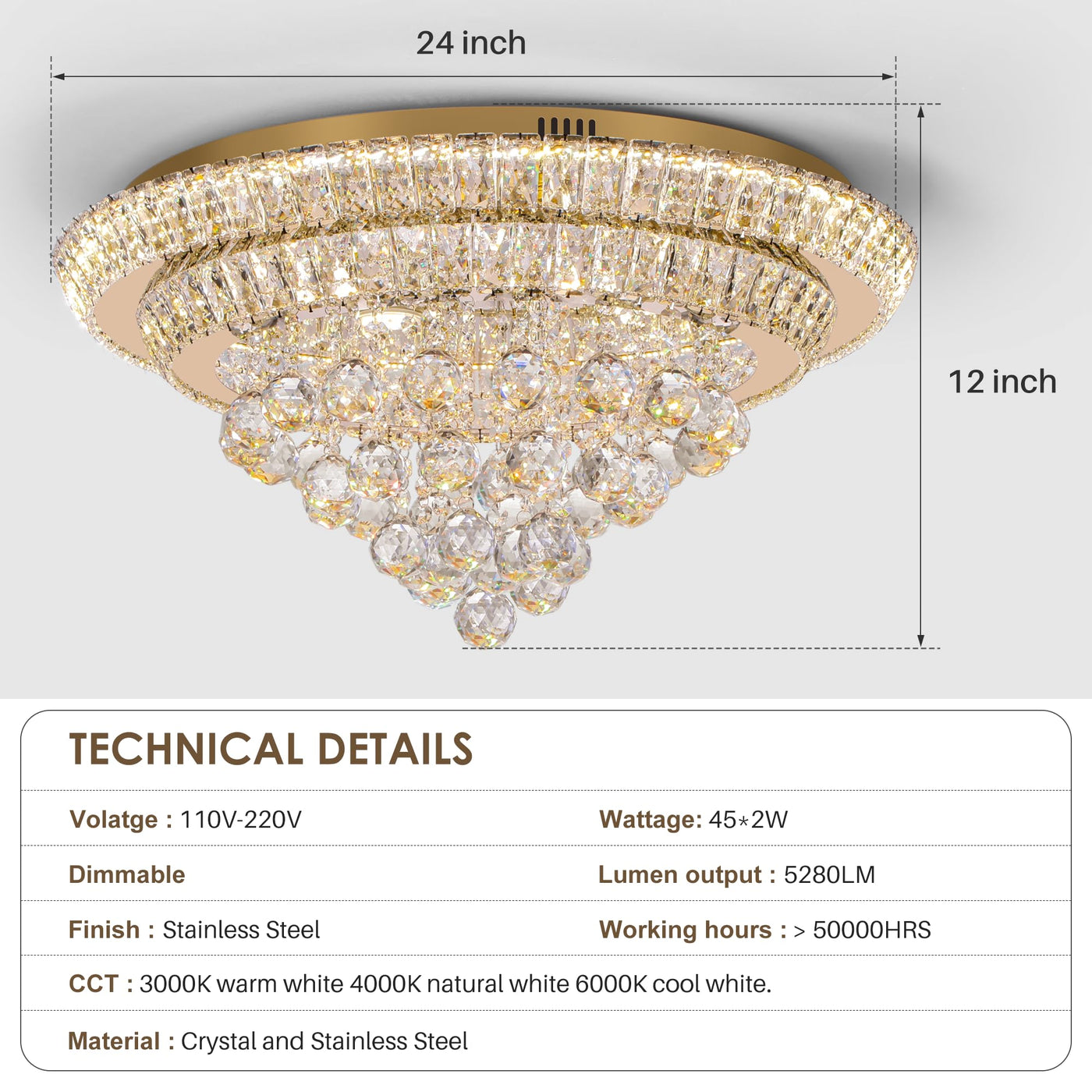 Modern And Elegant Design, Crystals Are Clear And Twinkling Will Gives Off A Soft And Warm Light, Which Is Rather Friendly To The Eyes, Caring For You And Your Family. Crystal Ceiling Lamp Makes Your Life More Gorgeous And Exquisite,This Ceiling Chandelier Is Suitable For Indoor Use, Such As Living Room, Bedroom, Dining Room, Kitchen, Etc. Chandelier Details: Chandelier Size: 24'' X 24'' X 10''H, Canopy Size: 24'' X 24'' X 1.57''H Color: Chrome Material: K9 Crystal+Stainless Steel Light Source Type: Led Smd Bulb Voltage: 110V-220V Wattage: 33W*3 Light Source Color (Dimmable): Warm White( 3000K) Neutral White(4000K) Cool White (6000K) Recommended Area: 10-15?. Easy Installation: All Parts Assembled, Just Install The Ceiling Plate Will Be Ok. This Contemporary Square Ceiling Chandelier Light Fixture With Simple And Luxury And Modern Look, It Will Be Never Out Of Date, The Ceiling Light Fixture Uses High-Quality Materials, K9 Crystals And Stainless Steel, Makes The Light Looks Glamorous And Classy And Enhance Your Home Decor; When You Turn On The Light,3 Color Temperature Replacement, Brings Different Ambiance In Your Home, Warm And Romantic, Looks Very Luxurious!