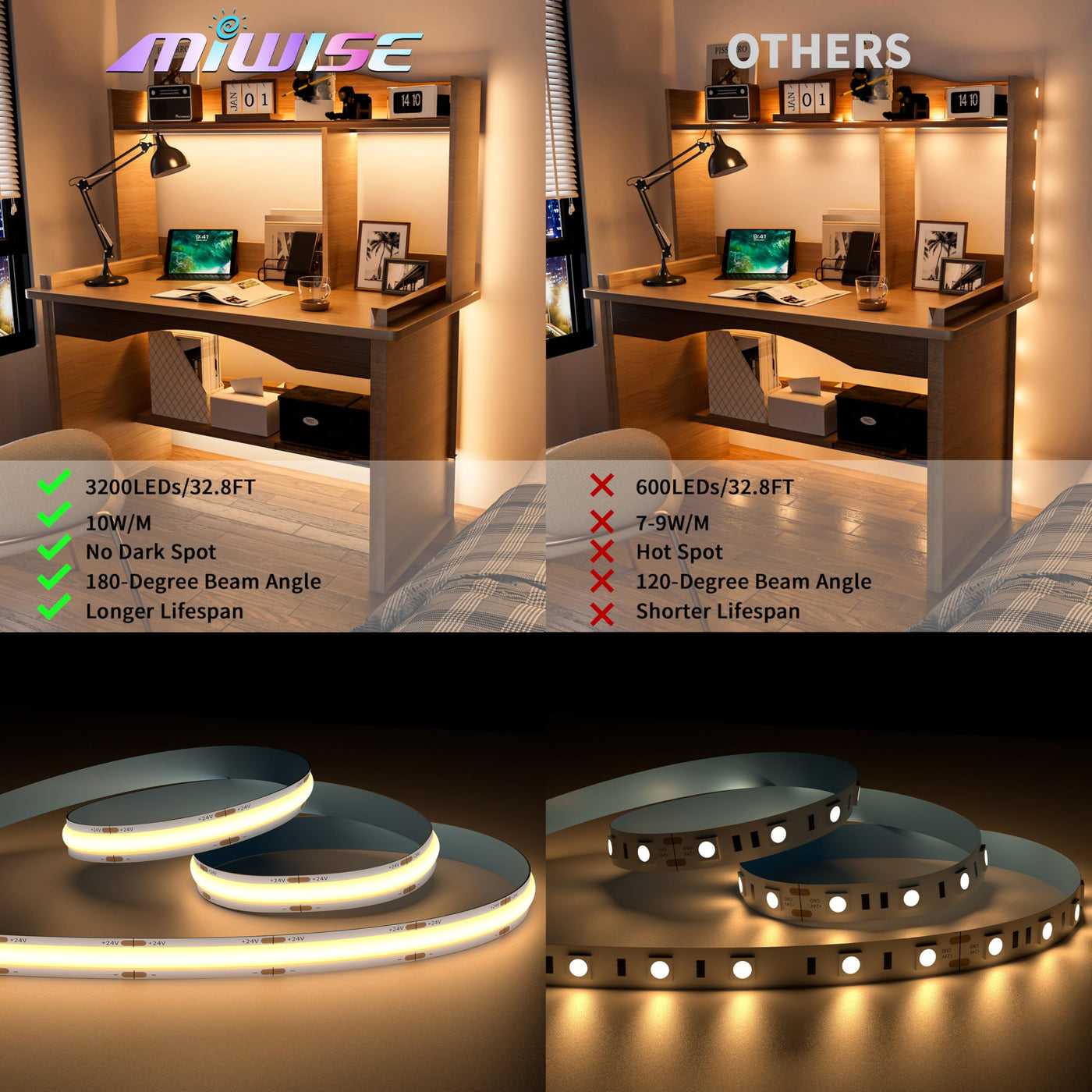 Q: What are the advantages of using MIWISE COB LED strip lights compared to traditional LED strips?A: MIWISE COB LED strip lights feature a continuous light appearance with almost no dark spots, thanks to their 180-degree beam angle. This professional-grade design enhances illumination compared to traditional SMD LED strips, providing a more uniform light distribution.