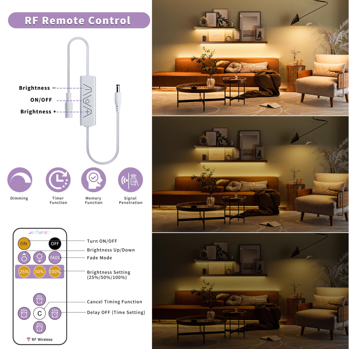 Q: How do I control the brightness of the MIWISE COB LED strip lights?A: The MIWISE COB LED strip lights come with an RF remote control that offers 11 brightness levels. You can adjust the brightness from any angle, and the controller includes a memory feature to retain your last setting even after being powered off.