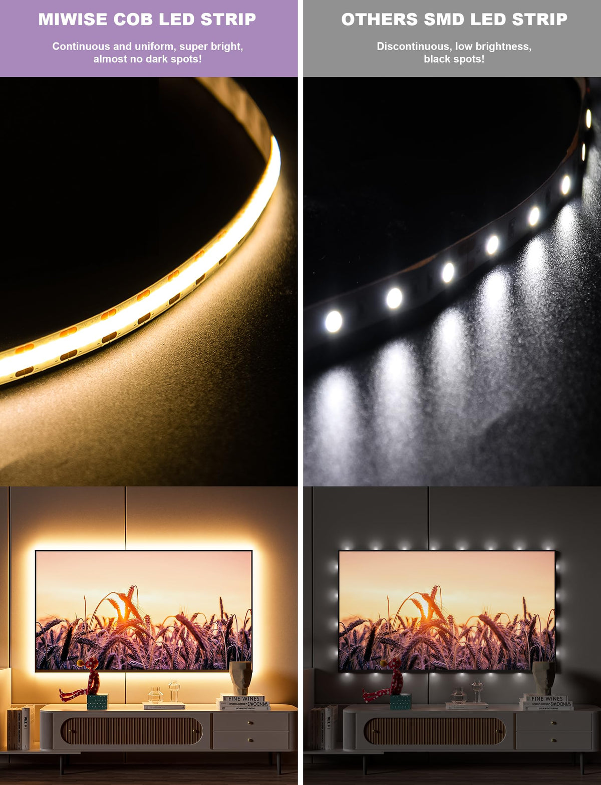 Q: What is the length of the MIWISE LED Strip Lights?A: The MIWISE LED Strip Lights are 9.84 feet (3 meters) long, providing ample length for various lighting applications.