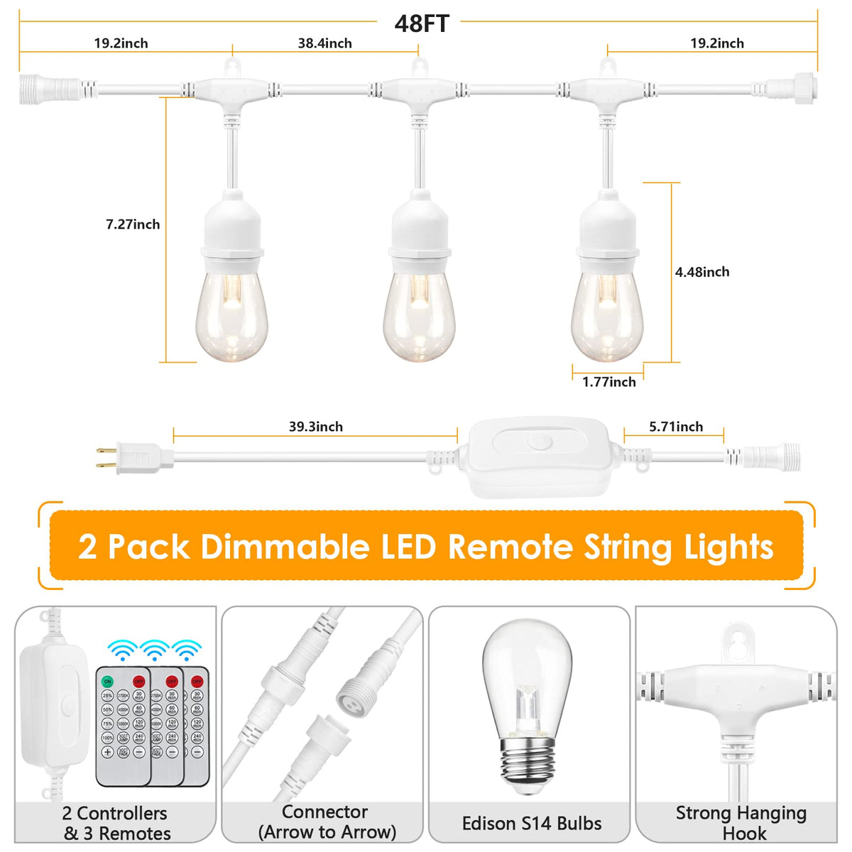 White Cord 3 In 1 Outdoor Dimmable Cafe String Lights - More Than Patio Ambient Lighting This Commercial Grade Led Outdoor Bistro String Lights You Check Now Is The Latest Dimmable Light String In The Market, Dimming By Included Remote Controller- Just Simply Press The Button To Control The Ambience For Your Space; No Need To Buy Dimmer Anymore!! Also With 3 Color Temperatures(2700K/ 4000K/ 5000K) For Choosing, You Can Decorate Any Of Your Space Into Warm Light, Soft Light Or Daylight. Get This String Lights, Equals To Have 3*Led Patio String Lights + 1*Dimmer. No Hesitation, Just Take It- We'Re Always Standing Behind Our Lights. All In One Led Outdoor Dimmable String Lights Simply Press The Button To Choose Desired Light Color And Brightness 4 Level Timer Function From Our Survey About Led Bistro String Lights, We Found That Many Users Purchase Timer Plug With String Lights, So We Equipped The Lights With Timing Function. 30Min/ 60Min/ 120Min/ 240Min Timer For Choosing. 24V Safe Working Voltage Design The Led Patio String Lights Are Added A Voltage Protection Device So That The Output Voltage Is Low 24V To Ensure Safety When Using. ***Comes With 2Pcs Remote Controllers, Always A Back-Up For You- No Worry For The Remotes Missing***