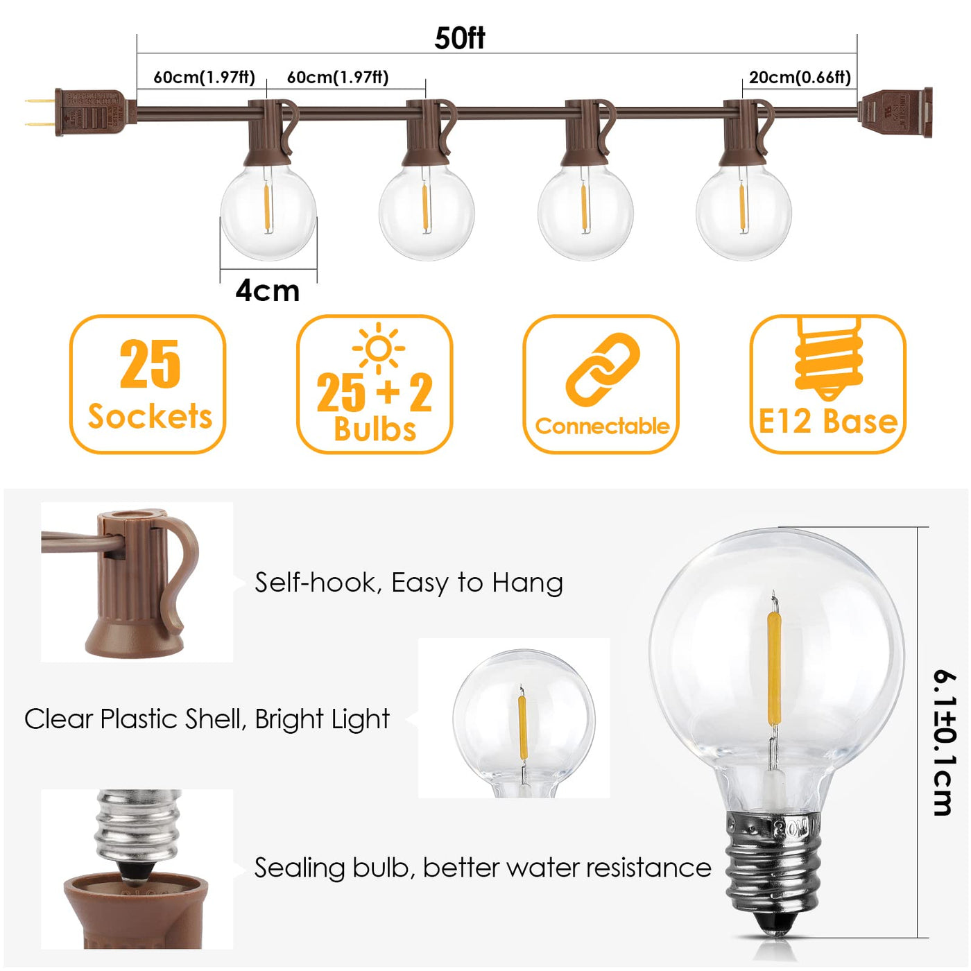 Mlambert Brown Cord Globe Bulb String Lights Providing The Ideal Amount Of Brightness For Patios, Backyard Garden Indoor And Outdoor Areas. No Need To Waste Time Browsing Other Light Strings, Our G40 Light String Has Been Prepared For You - Dimmable, Energy Saving, Waterproof, Shatterproof, Year-Round Use. End-To-End Connectable Outdoor String Lights Connects Up To 19 Strands. Two Prong Connector Plug On One Side (Male) And Open Connected Plug On The Other (Female) Allows To Be Connected. You Can Create A Larger Outdoor Area With More Lights. Don'T Worry That The Length Of The String Is Not Enough To Cover The Area You Want To Illuminate. Outdoor Patio String Lights With 2 Safe Fuses Spare Fuse For A Backup Please Tighten Each Bulb Before Use, If The Light String Does Not Work, Then Replace The Fuse Inside The Plug. Hanging String Lights With Hook Easy To Install In Just 15 Minutes Our String Lights Are Packaged With The Bulbs Already Screwed. The Light Sockets Come With Hanging Hooks That Are Also Easy To Hang And Install Ith Guide Wires, Or Zip Ties, Just Easily Pick Where You Want To Hang Them And Plug Them In And These Bulbs Will Work Perfectly To Light Up Your Night And Space. The Reason You Will Love Our 50Ft String Lights: Made Of Durable Plastic Bulbs That Easy To Take Away And Put On, Easy To Carry And Storge. Take Them To Decorate Your Camper Or Rv Is A Good Choice, It Is Also Perfect For Your Deck, Porch, Bistro, Cafe, Restaurant, Garden, Camping Tent, Backyard, Wedding, Party, Celebration, Pool Umbrella, Christmas Tree Decoration, Holiday Decoration Or Other Occasions. These Are Led Bulbs, Not The Incandescent Bulbs, Safer And Cooler When Using. And Led Bulbs Is Energy-Saving, Saving Your Electricity Bill.