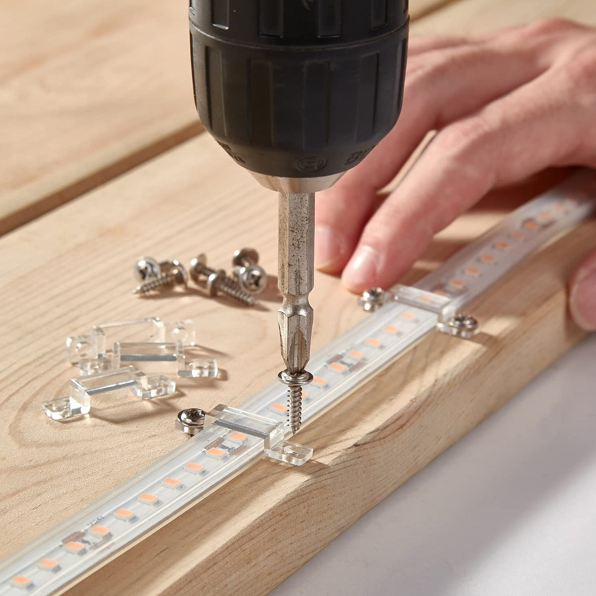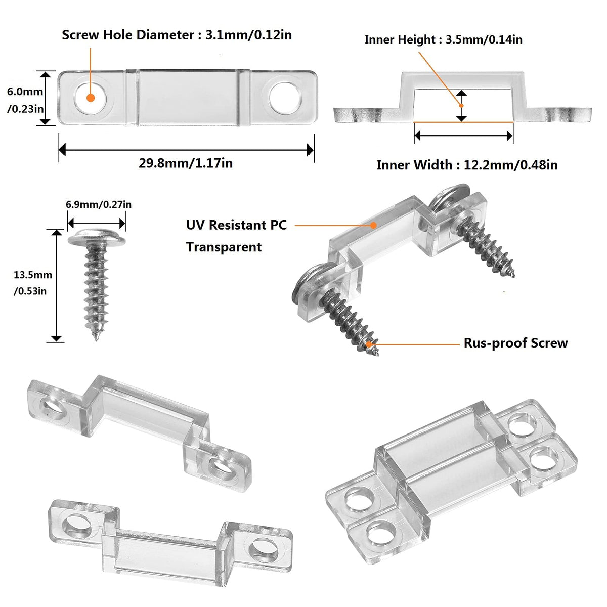 These waterproof LED mounting clips are upgrading design,compare with traditional one-side fix clip and soft silicone fix clip this LED fixing clip have fellow advantage: 1)Double holes and rigid: hollow heigh only 3.58mm/0.14inch(old one is 4.0mm) so this fix clip more cling to the led tape.more tight after fix the screws.never worry about the led strip light slide or drop. 2)Pure transparent: light transmittance from 90% increase to 98% more easy to hide in plain sight Note:Before buy this led strip light holder pls kindly check up your led strip light width and height.1.Only suit for 12mm/0.48inch IP67/IP68(silicone tube) led strip light which is DC12V/24V input.egSMD3528 120/128/140leds/meterSMD2835 120/128/144/168leds/meterSMD5050 30/60/72leds/meter RGB/RGBW/CCT colorSMD5630 30/60/72leds/meterCOB 480/512/608/804leds/meter2.Can not use for IP20/IP44/IP65 led strip light and led rope lightUse and Installation:1.Before installing the LED clips.Please make sure the light power turn off.2.Use drill tools punch holes in cement wall/tile wall/thick metal surface and make the markings.For wood/thin metal surface no need puch holes in advance 3.Putting screws through the clips and then fixed the screw in the marked mounting holes(Please be careful not to tighten it completely).4.Adjust led strip continue to tighten the screw until the clip completely holder the light strip.5.Check all fixed.suggest using 3-5 pieces clips within 1 meter long strip lightsSpecific Details:Product Size: L:29.8mm/1.17in Width:6.00mm/0.23in Height:5.40mm/0.21in.Inner Width: 12.2mm/0.48inInner Height:3.5mm/0.14inOperate temperature:-20C-65CFlame retardant rating: UL94V-0Material:PolycarbonatePackage Includes: 100 pcs led strip fixing clips(transparent)202 pcs screws