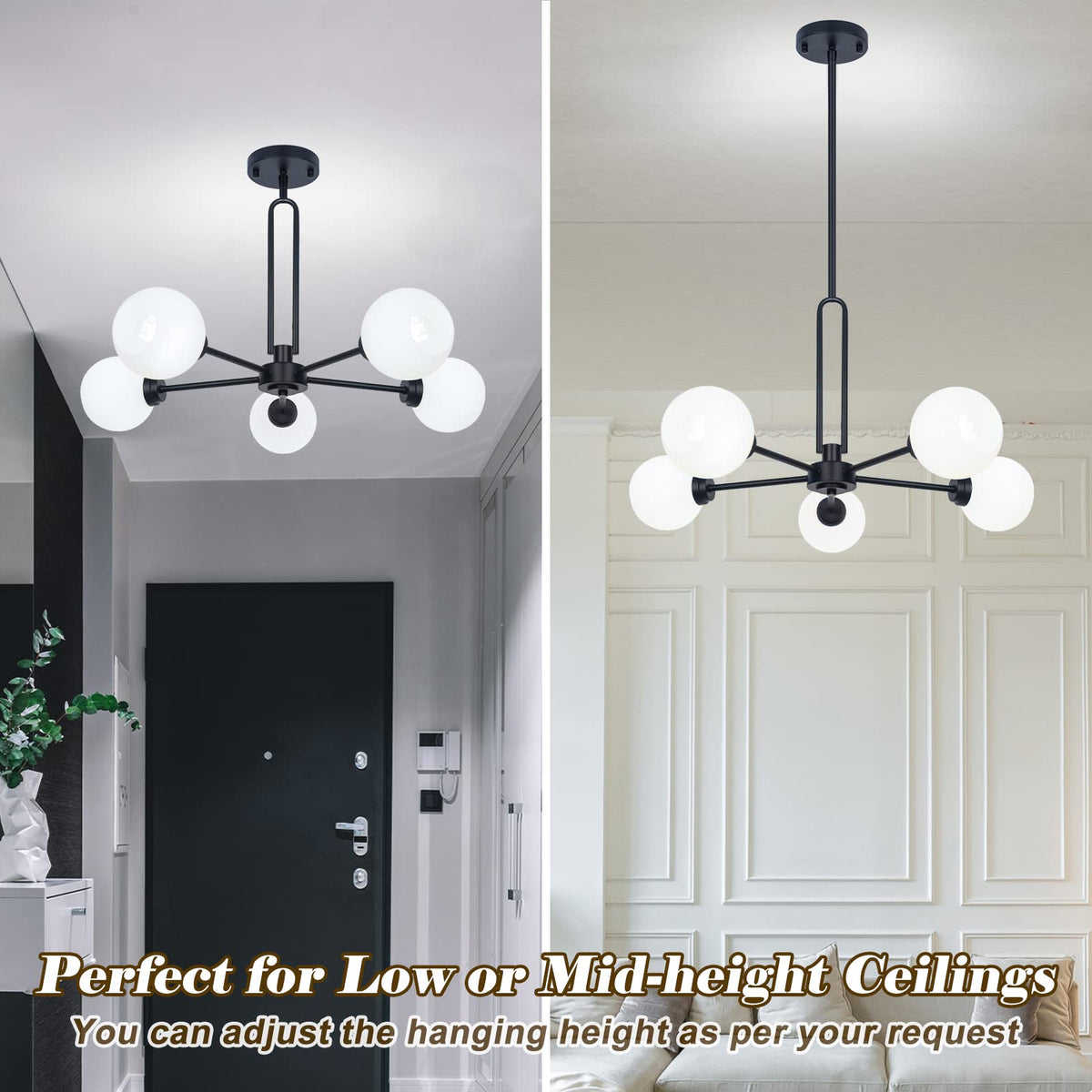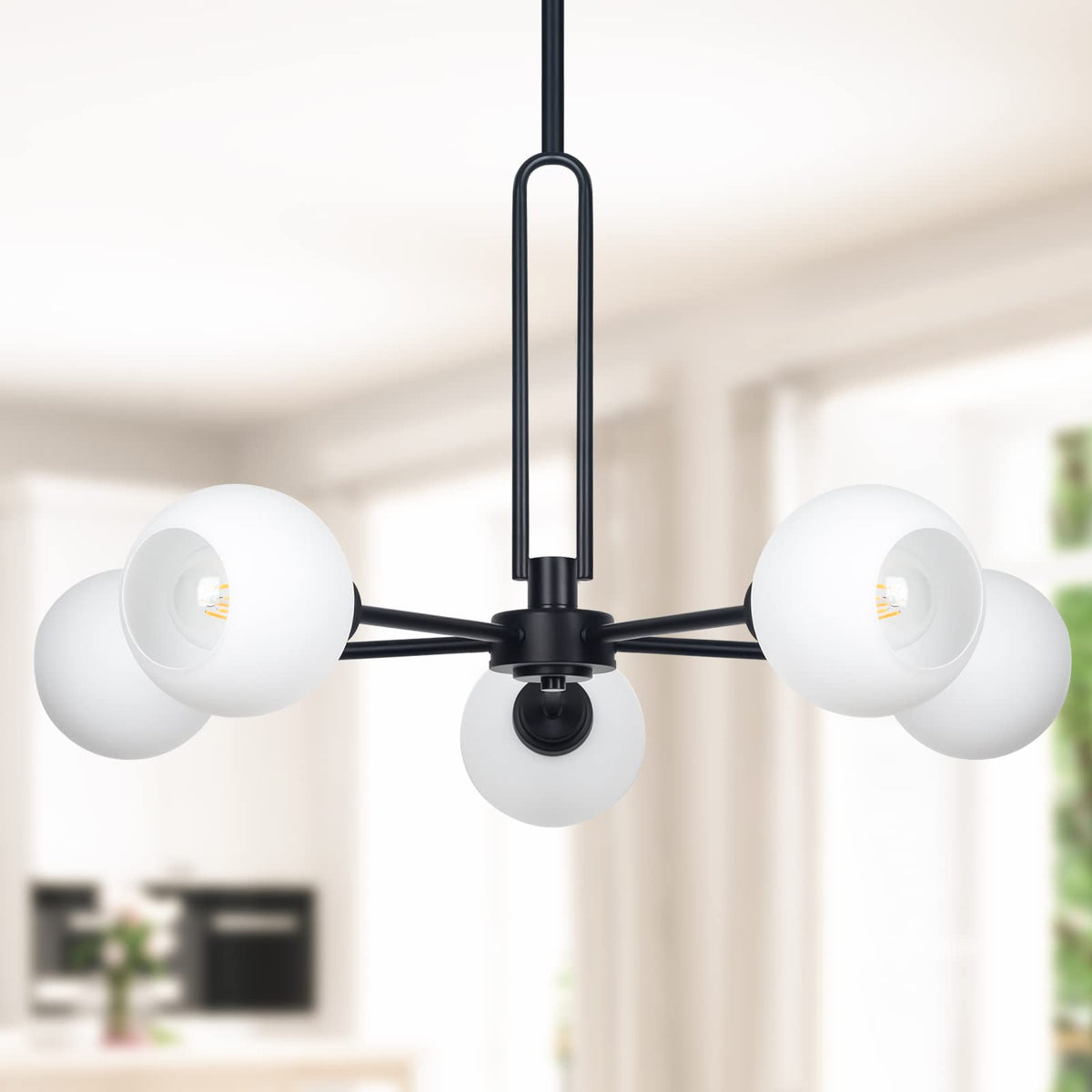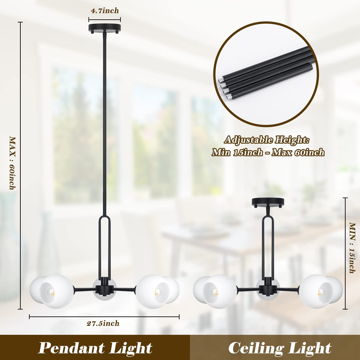 5-Light&Nbsp;Pendant Light &Amp; Semi-Flush Mount Ceiling Light The Modern Globe Chandelier Is Designed With An Elegant/Cool Look And Well-Made Material. It Features A Sleek Matte Black Finish And Clear Glass Globe Shades, Which Is So Attractive. For Indoor Use,&Nbsp;It Is Easy To Install And Fits Many Ceilings Such As Flat, Sloped And Vaulted Ceilings With Angles Up To 40 Degrees. Equipped With Adjustable Rods For Added Flexibility In Hanging At Different Heights. This Dining Room Light Fixture Over Table Will Not Only Bring Enough Bright Light To Your Home, But Also&Nbsp;It Will&Nbsp;Bring A More Modern And Fashionable Sense To Your Space, Which Is A Perfect Space Art Decoration. &Nbsp; Sturdy And Stable Premium Metal Material With Double Layer Plating, One Layer Of Electrophoretic Brushed Nickel, And One Layer Of Electrophoretic Brass, Which Makes The Metal Surface More Beautiful, Wear-Resistant And Corrosion-Resistant. It Is Very Stable And Durable, Also Avoids Rusting During Long Time Use. Easy To Clean. &Nbsp; White Frosted Globe Glass Shade This Top-Quality Milky White Glass Lampshade Is No Shadows And Impurities, Providing An Even, Soft Light That Protects The Eyes. The Globe Shape Design Is Popular And Simple, Adding Contemporary Style To Your Ceiling Space. &Nbsp; ?Specifications: Fixture Design: Geometric And Sputnik Category: Pendant Light / Ceiling Light Compatible With All Types Of Bulbs Including Led, Incandescent, Halogen, Etc. G16.5, G45, A19 Bulb Recommended (Sold Separately) Compatible With Most Dimmers Including Lutron, Phillips, Wemo, Honeywell And Others &Nbsp;Adjustable Hanging Length: Yes Hanging Method: Rod (Fully Adjustable Rod Length) Max. Height: 60'' Min. Height: 15''&Nbsp;