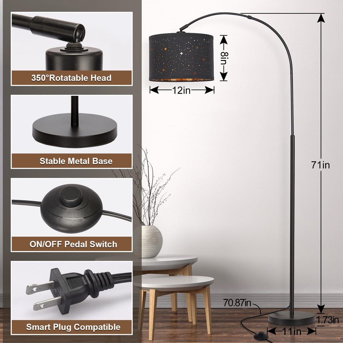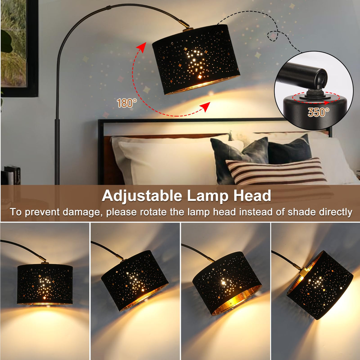 Modern Arc Floor Lamp, Tall Pole Lamp With Black Stars Lampshade, Arched Reading Light With Adjustable Lamp Head, Over Couch Han