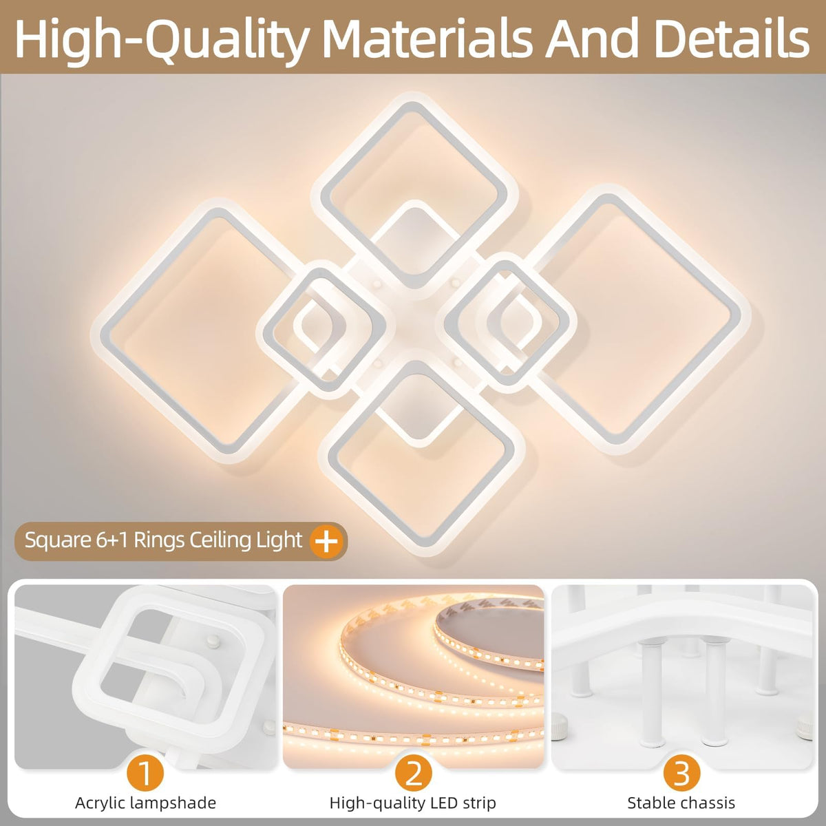 Modern Ceiling Light, 40.2'' Led Dimmable Acrylic Square 6+1 Rings Ceiling Lights With Remote, White Flush Mount Ceiling Light F