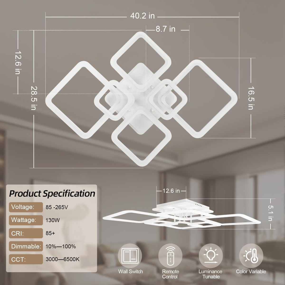 Q: What are the dimensions of the Modern Ceiling Light?A: The Modern Ceiling Light measures 40.2 inches in length, 28.5 inches in width, and has a height of 5.1 inches, making it suitable for low ceilings.