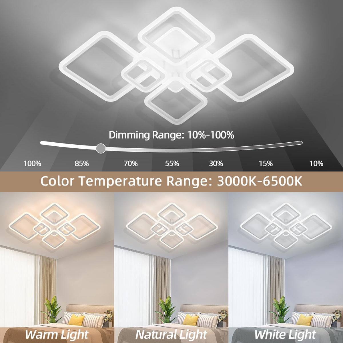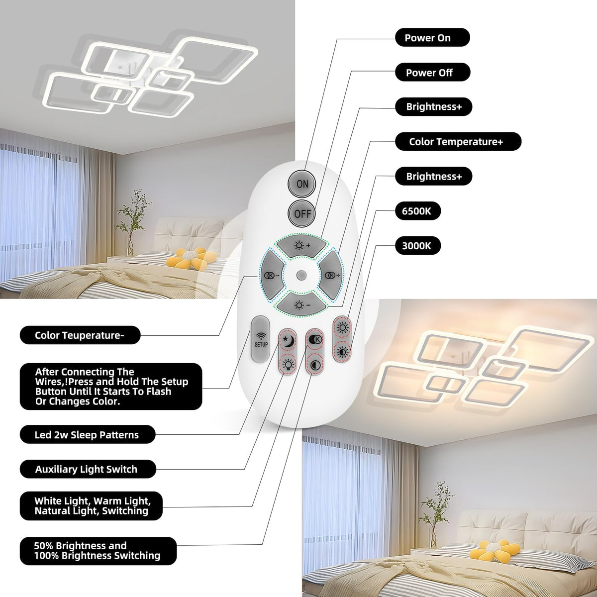 Q: How does the remote control work for this ceiling light?A: The ceiling light comes with a remote control that allows you to adjust the brightness from 5% to 100% and change the color temperature between 3000K (warm white), 4000K (neutral), and 6500K (cool white) for versatile lighting options.