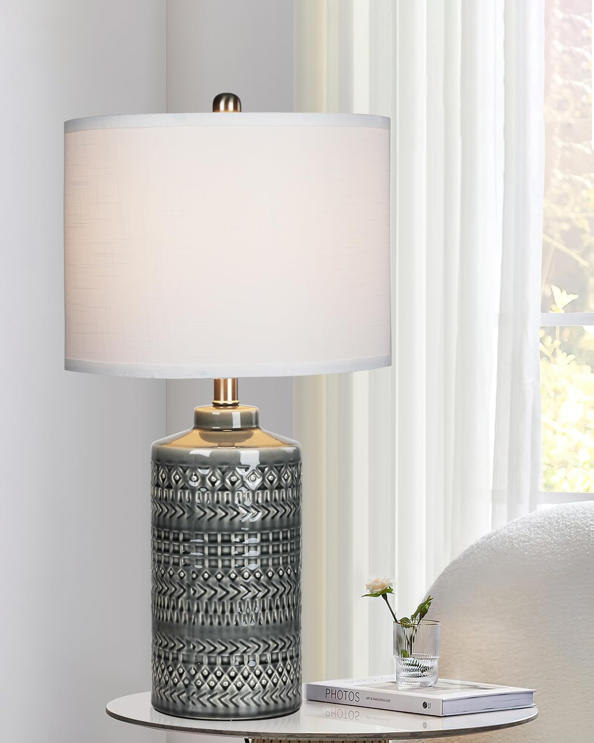 JUNNAI 24.5 Gray Ceramic Table Lamp - 3-Way Dimmable Nightstand Lamp with White Shade for Living Room, Bedroom, Office Decor (Bulb Included)