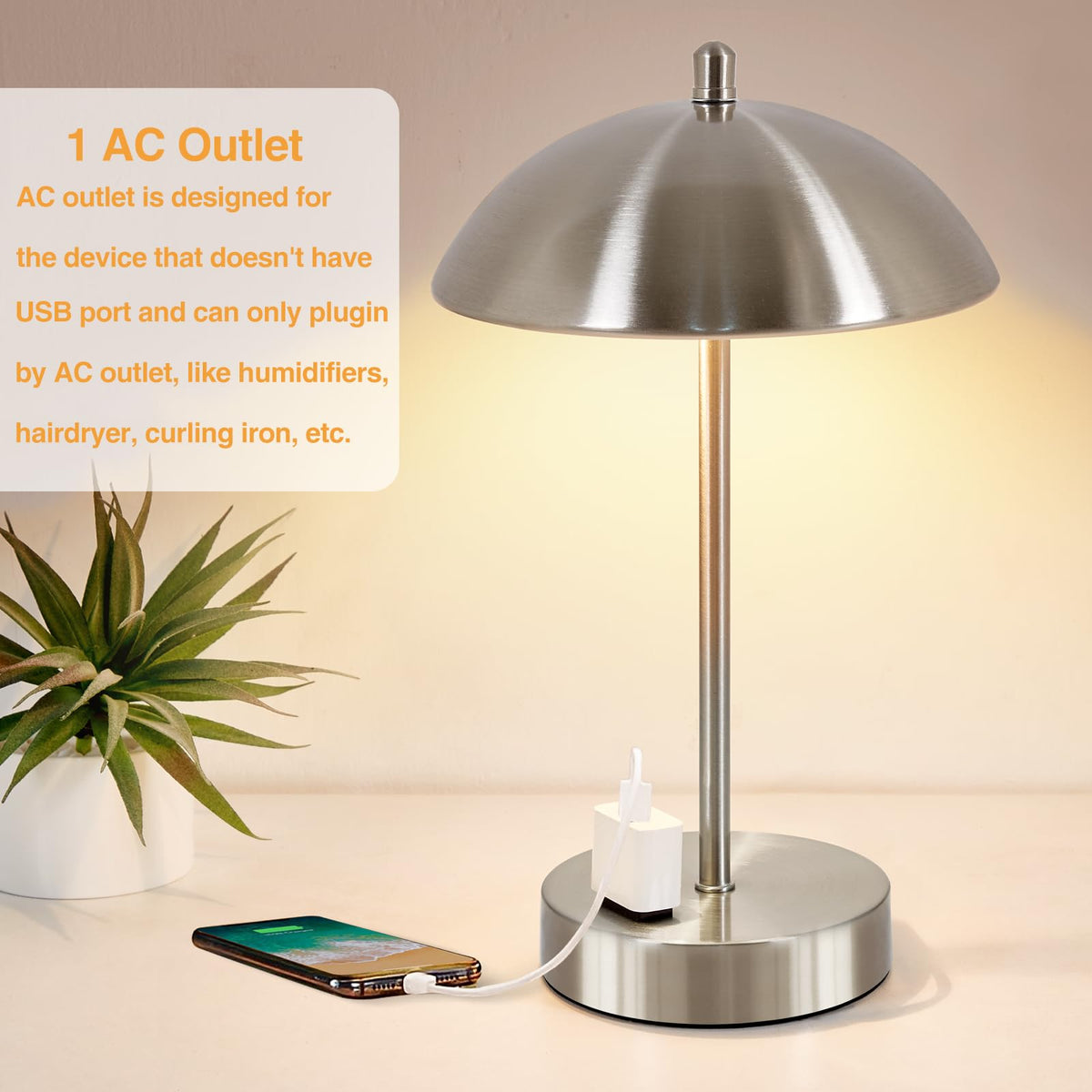Q: What are the main features of the Modern Desk Lamp?A: The Modern Desk Lamp features a minimalist design with a brushed nickel finish, a 3-way dimmable touch function for easy brightness control, a durable metal construction, and an integrated AC outlet for convenient charging of devices.