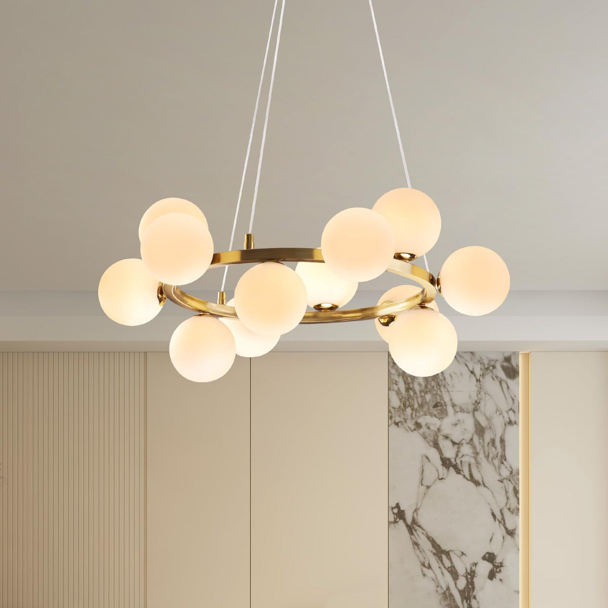 Modern Globe Chandelier, 12 Lights Gold Bubble Chandeliers 23.6'' Mid Century White Glass Globe Pendant Lighting For Kitchen Isl