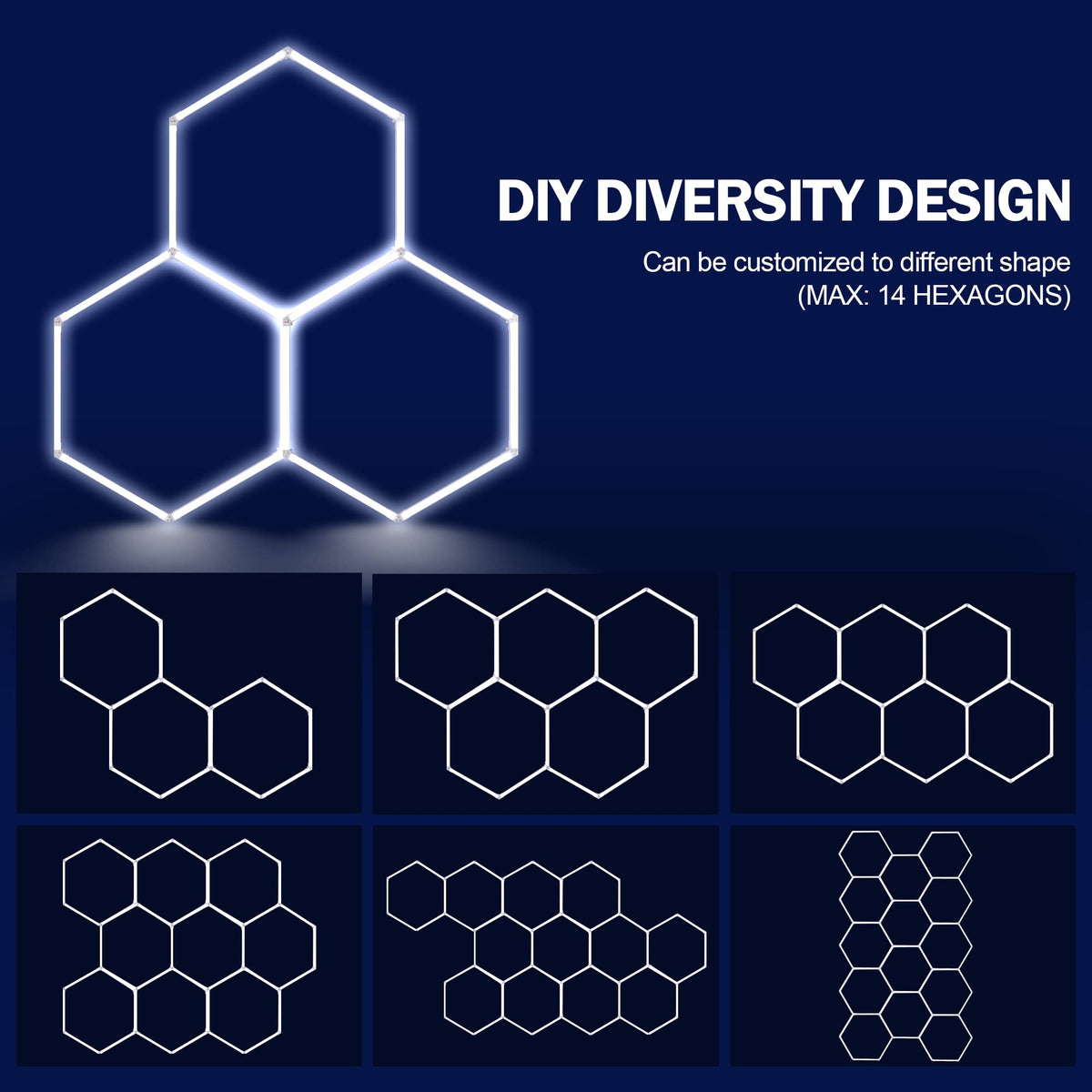 Illuminate your space with the MODERN Hexagon LED Garage Lights, designed for optimal brightness and efficiency. With an impressive 105W power output yielding 12600 lumens and a color temperature of 6500K, these lights are ideal for various settings, including garages, shopping malls, barber shops, exhibition rooms, auto repair centers, and gyms. The innovative hexagonal grid system is constructed from premium PC materials, ensuring electrical insulation and enhanced safety.