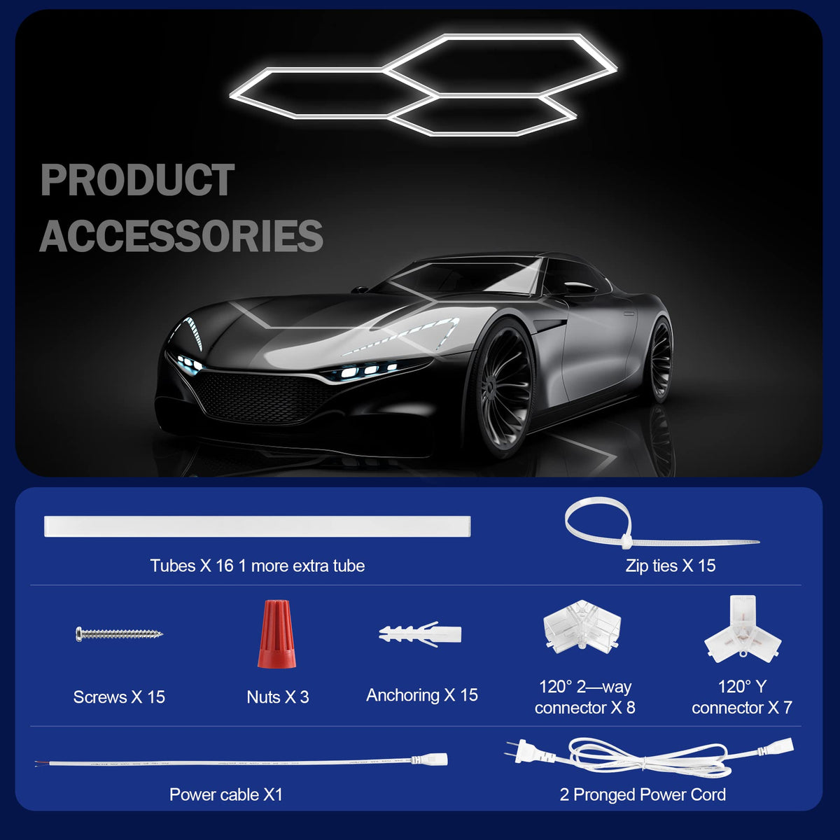 Q: What accessories are included with the MODERN Hexagon LED Garage Light?A: The product includes a comprehensive set of accessories, such as 15 light tubes for creating the hexagonal grid system, additional replacement tubes, various connectors (120° and Y shape), anchorings, screws, zip ties, nuts, a power cable, and a power cord with a plug, ensuring everything needed for installation is included.
