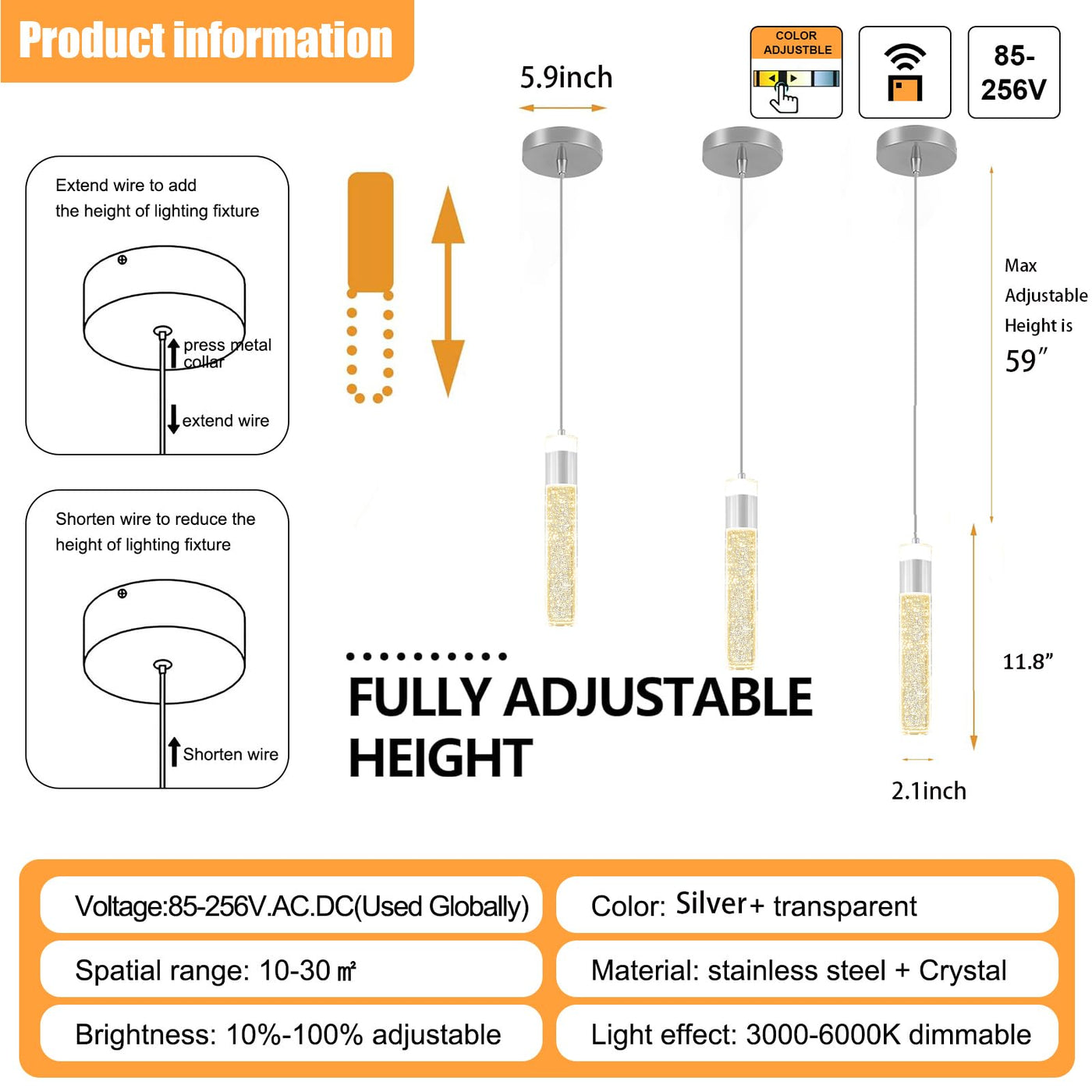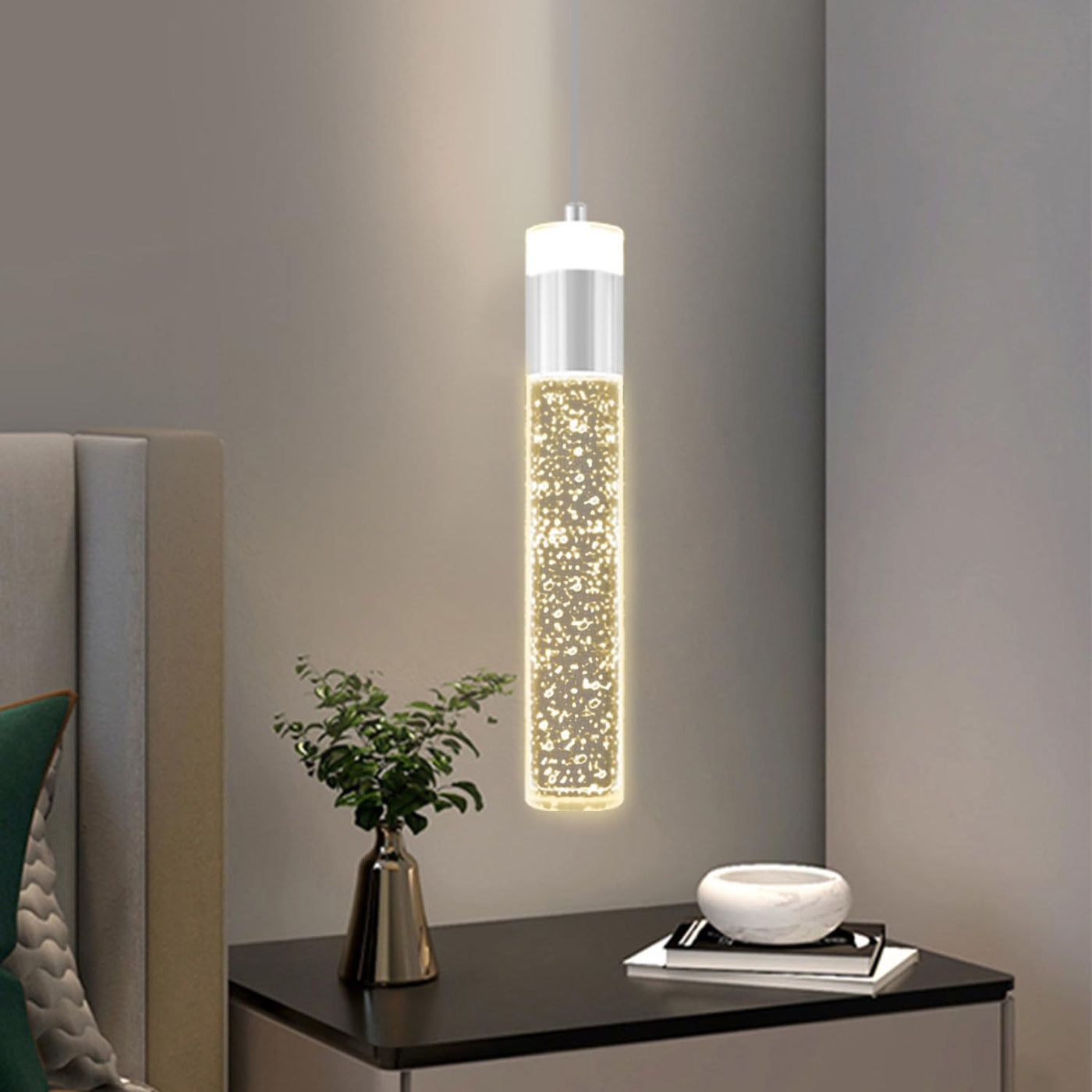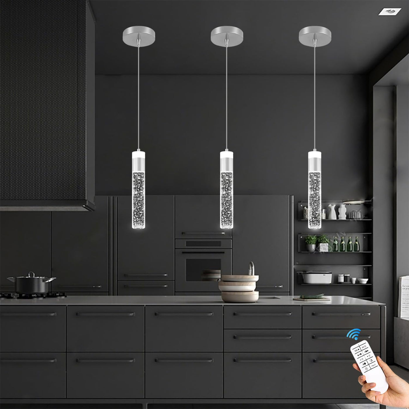 Modern Led Chrome Crystal Pendant Light Kitchen Island, Bedroom Bedside Hanging Ceiling Lamp With Crystal Bubble Column, Dimmable 3000K-6000K 1-Light Independent