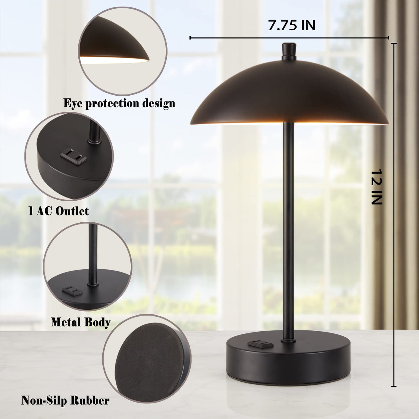 Q: What are the key features of the Modern LED Desk Lamp?A: The Modern LED Desk Lamp offers a stylish design with a matte black finish, a 3-way dimmable touch function, and a convenient AC outlet for charging devices. It is made of durable metal and includes a bulb, making it ideal for various settings like bedrooms, offices, and living rooms.