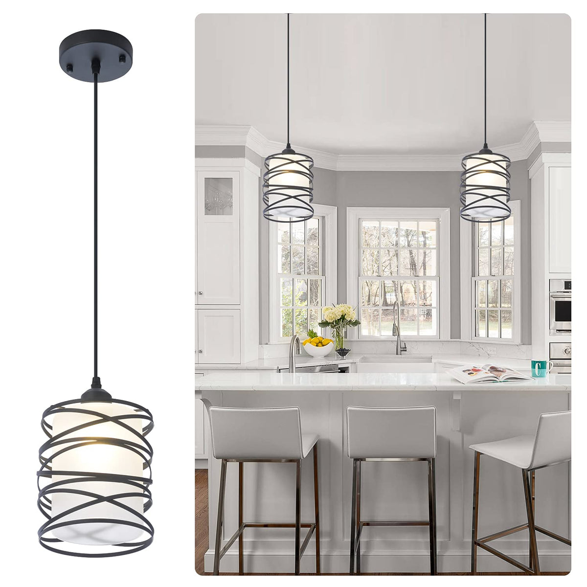 Modern Mini Pendant Light Fixture Kitchen Island Pendant Lighting 630Matte Black Spiral cage and Handblown Frosted Haze glass Shade Hanging Lamp Adjustable cord for Dining Room (1-Pack),E26, MAX60W