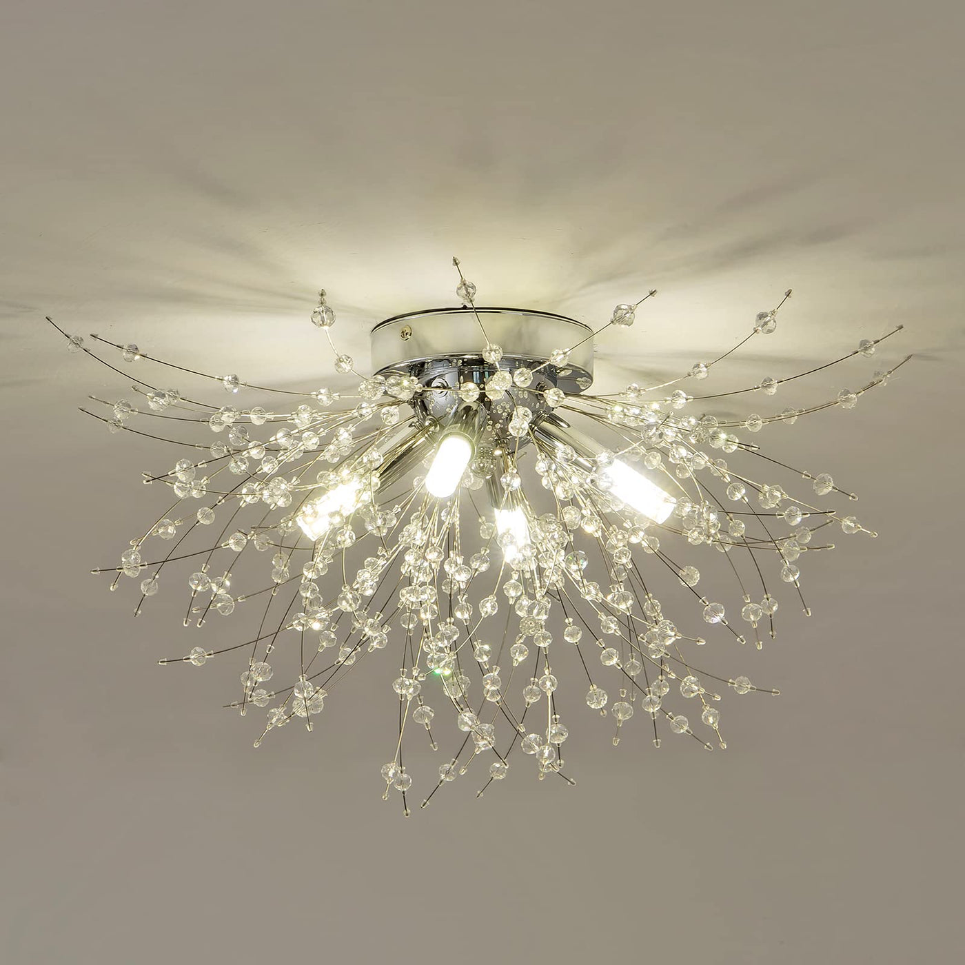 Close to Ceiling light Size: 9.5 inches high and 17.7 inches wide. Suggested Room Size: 7-10? .(Please note the size before order) Comfortable Glow: 120V 40watts; Bulb base: G9. (*BULBS NOT INCLUDED* You need to get 4*G9 Led Bulbs depending on the lighting effects you want). It is also can be dimmable when you used a dimmable bulbs and compatible dimmer switch. Unique Design: This sputnik flush mount ceiling light is designed with crystal firework shape, so elegant and gorgeous that adds a beautiful decor to your house. This ceiling lamp is a great choice for nearly any space such as hallway, entryway, living room, bedroom, basement, bathroom, kitchen, also perfect for commercial lighting in office, shops, etc. Easy To Assembly: The crystal ceiling chandelier is easy to install. You will save your time and be happy to enjoy your new decoration. Worry-Free Guarantee: Please do not hesitate to contact us if there is any quality issue or you are not happy with your purchase(90 Days Money Back and 2 Years Replacement Warranty).
