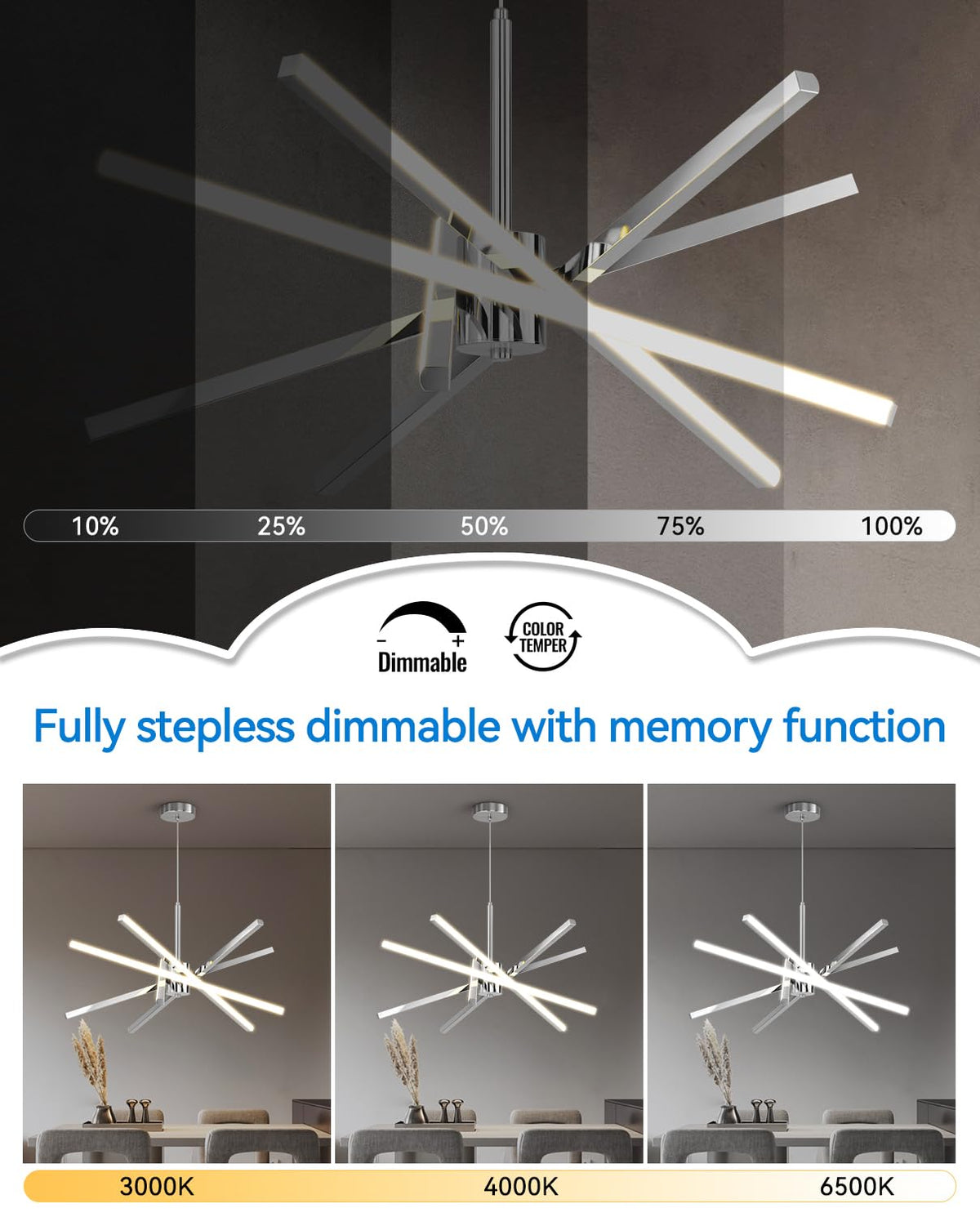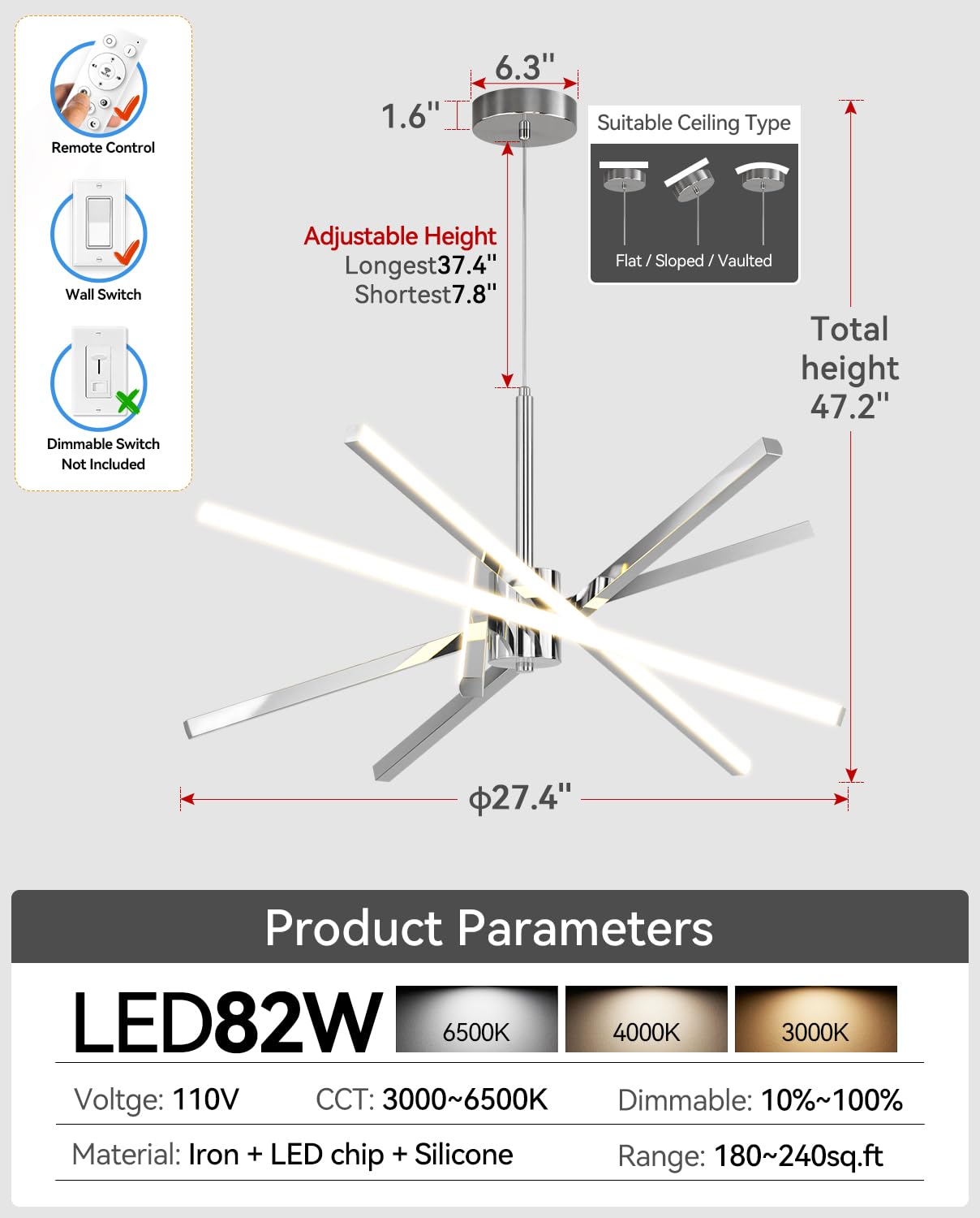Modern Sputnik Design - Sleek And Stylish, This Contemporary Chandelier Adds A Statement Touch To Any Space With Its Eye-Catching Sputnik-Inspired Design. High-Performance Led - Equipped With An Energy-Efficient 82W Led Light Source, Providing Bright And Uniform Illumination While Reducing Energy Consumption. Dimmable With Remote Control - Easily Adjust Brightness And Color Temperature To Create The Perfect Ambiance Using The Included Remote Control. Versatile Placement - Ideal For Dining Rooms, Living Rooms, Kitchens, And Bedrooms, Enhancing The Aesthetic Of Modern And Contemporary Interiors. Premium Quality & Easy Installation - Made From High-Quality Materials With A Durable Black Finish, Designed For Long-Lasting Use And Hassle-Free Installation. Upgrade Your Home Lighting With This Stunning Modern Sputnik Chandelier!