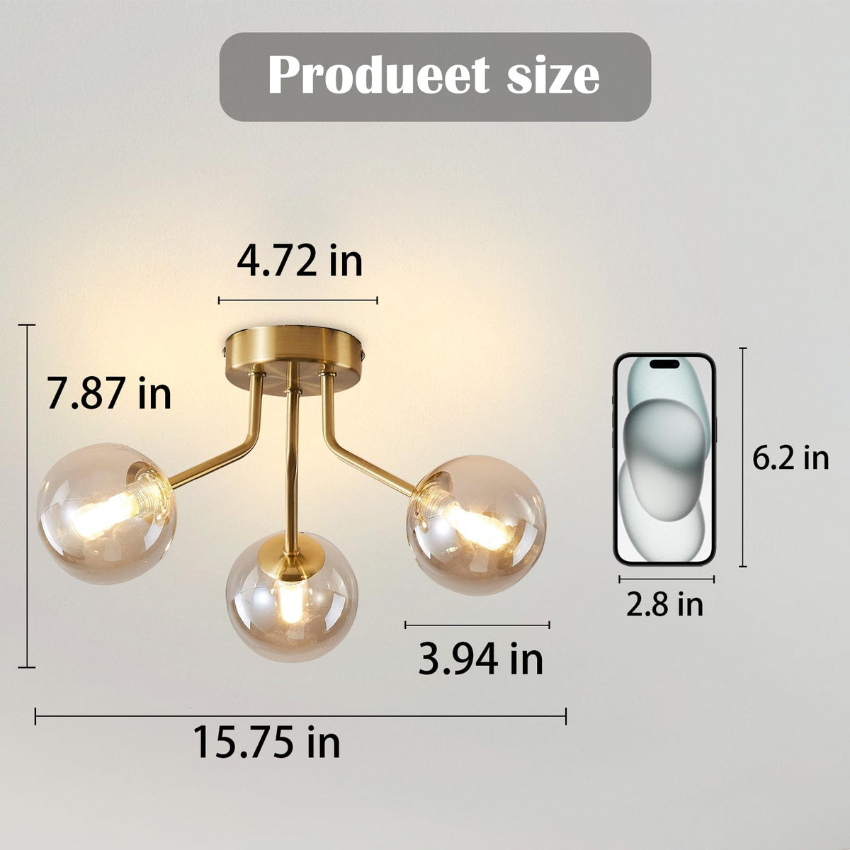 Modern Sputnik Chandeliers 3 Light Gold Semi Flush Mount Ceiling Light Fixture Pendant Lamps Bulbs With Glass Globe Lighting For