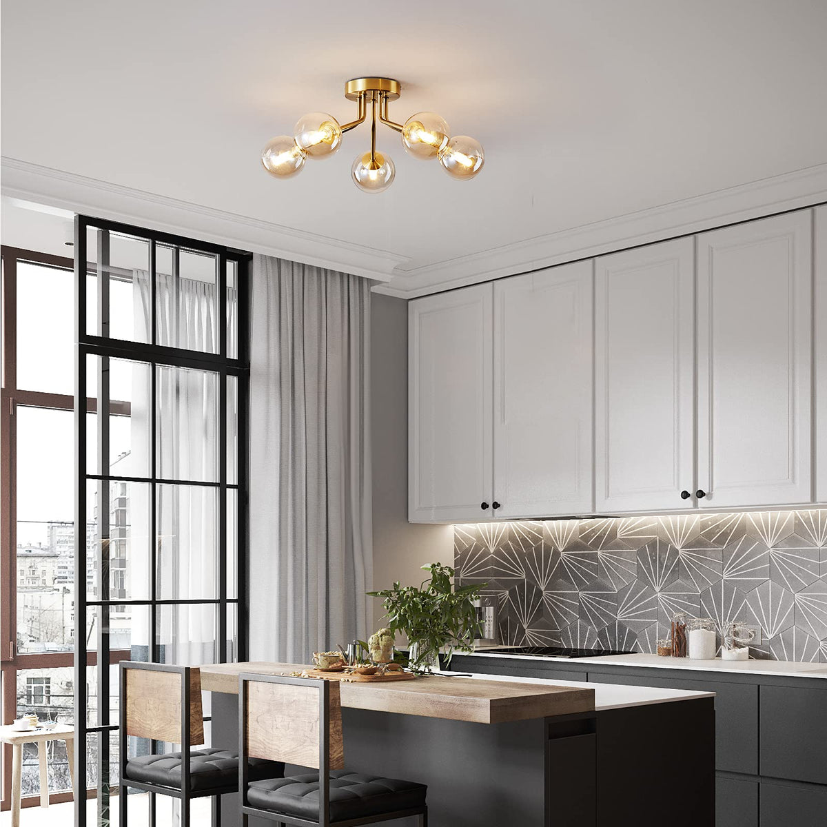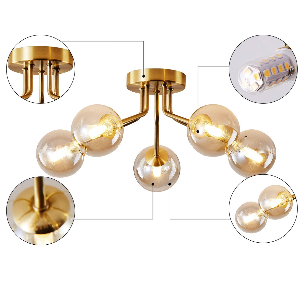 Q: What type of bulbs are compatible with the Modern Sputnik Chandelier?A: The Modern Sputnik Chandelier is compatible with G9 bulb bases, allowing you to use LED bulbs for energy savings and longevity. We recommend using globe bulbs for a comfortable and warm ambiance.