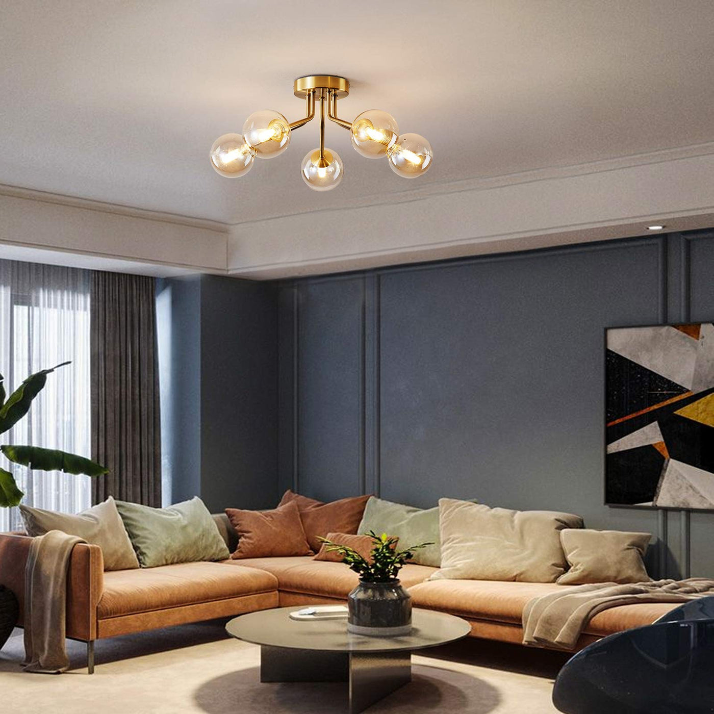 Modern Sputnik Chandeliers 5 Light Gold Semi Flush Mount Ceiling Light Fixture Pendant Lamps Bulb With Glass Globe Lighting For