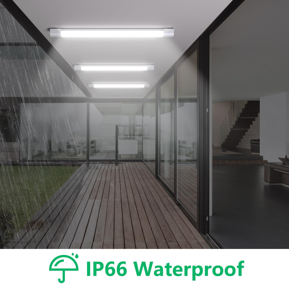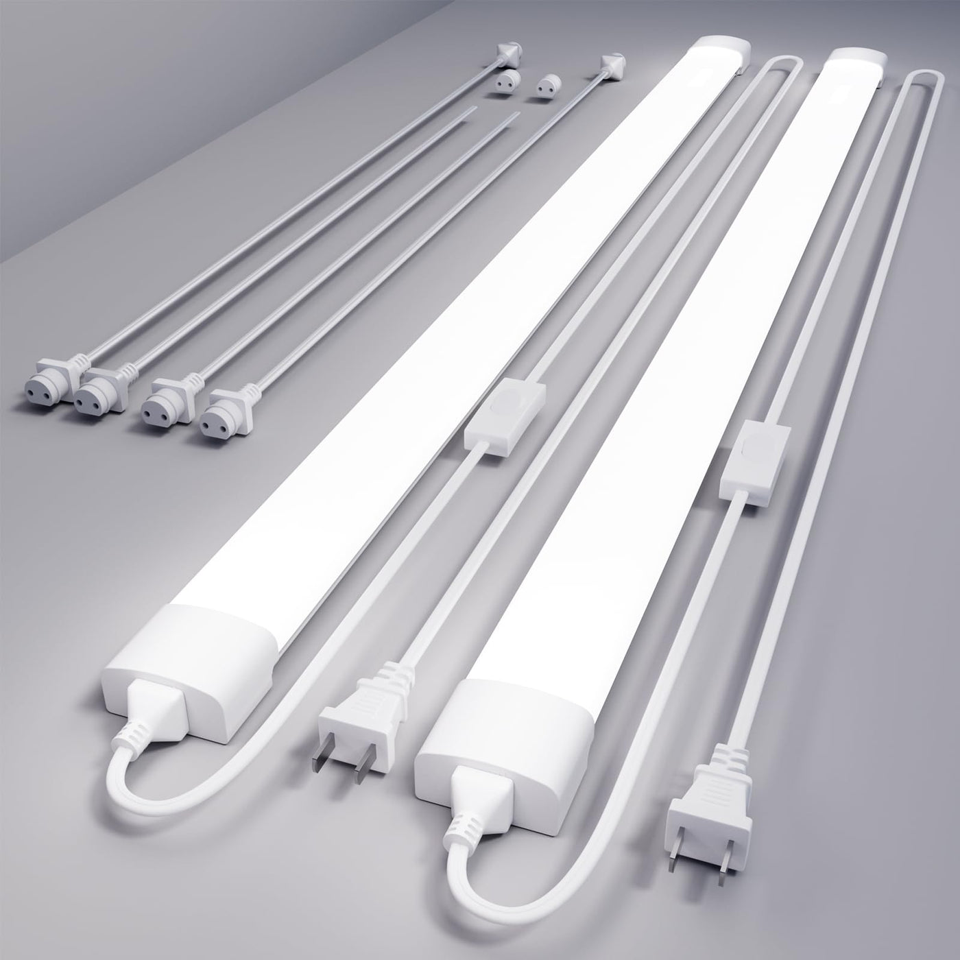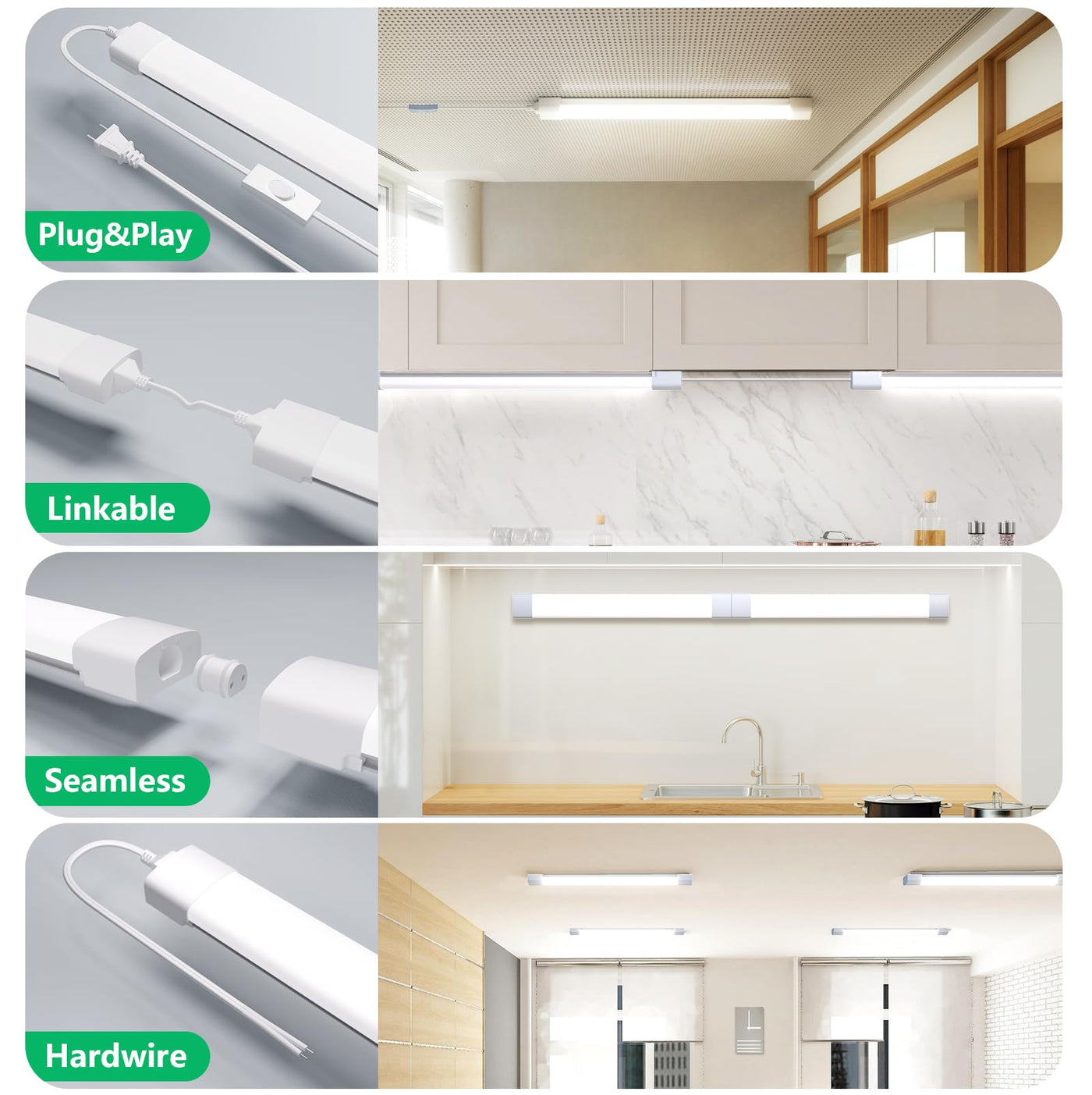 Features: vThis led tube lights support to connect up to 15 tube lights together. And plug-and-play and hardwiring both ways are available. vAdopt new technique, the consumption is lower than traditional light fixtures, save your electric costs greatly. vSuperior PC housing features corrosion resistance, fade-proof and waterproof, which help prolong its service life up to 30000 hrs. vNO flickering or humming, NO UV or IR Radiation, the led garage light is safe for home and environment. vComes with complete accessories, easy to install. You can mount it to walls and ceilings, vertically and horizontally accordingly. vWide usage, great for residential and commercial applications. Such as: Garages, Storage Room, Workshop, Equipment Room, Workplace, Porches and Patios, Warehouse, Basement, Plazas, Offices, Closets, Laundry, Hallways, Hotels, Schools, Subways Hospitals, Apartment, Supermarkets, Utility Room, Equipment and Recreation Rooms.