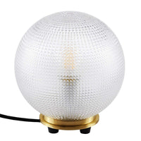The globe-inspired Destiny Frosted Glass Table Lamp radiates with contemporary clarity in your bedroom, living room, or office space. This side table lamp features a transparent glass orb shimmering with geometric texture and rests on a satin brass base. Destiny is a coffee table lamp displaying a crisp minimalistic aesthetic in mid-century modern, contemporary, or eclectic decors. The round iron base rests on four black rubber legs and comes fitted with a black power cord with an easy access on/off switch. The Destiny Table Lamp requires 1 E26 60W max bulb or LED equivalent (not included). Compatible with dimmer switches (not included). Clean with a soft, damp cloth.Features:Material: Glass, satin brassFinish: Satin brass, clearfrost, blackFrosted glass shadeBlack power cord with on/off switchBulbs: 1 E26 60W Max (Not Included)LED compatibleDimmable (switch not included)Specifications:Product Dimensions: 8.5"H x 8"W x 8"DProduct Weight: 3 lbs