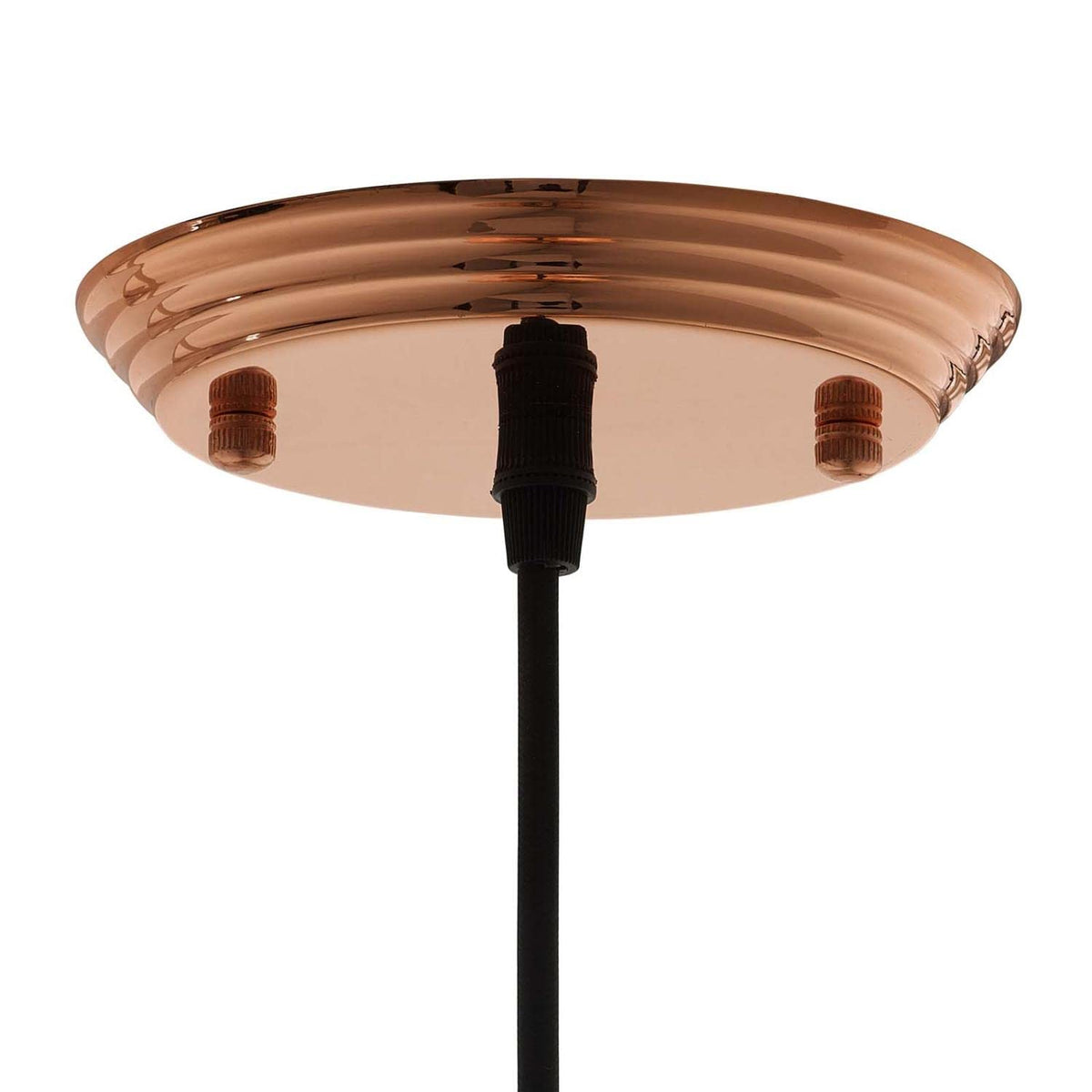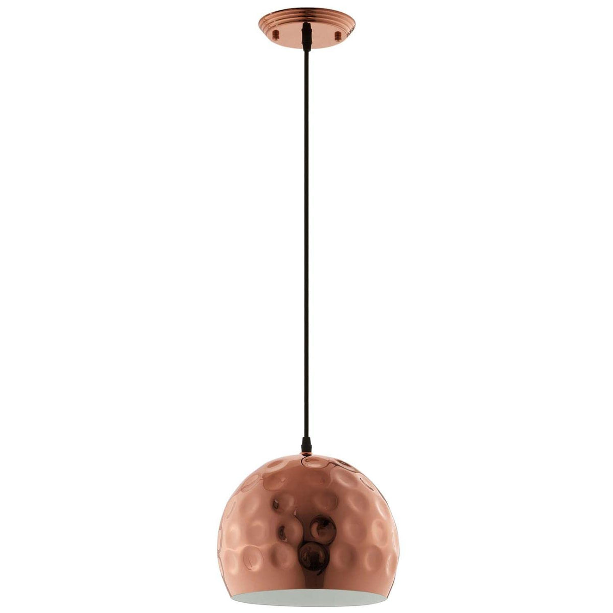 Introduce chic illumination with the Dimple Pendant Light. Suspended by an adjustable two-core braided cable, Dimple creates a delightfully distorted effect with the circular hammered detail across its steel surface. This sphere-shaped conversation starter is crafted with rose-gold plated iron and features a contrasting white underside. Dimple is designed for use with a single 60W light bulb (not included). Set Includes: One - Dimple 10 Half-Sphere Rose Gold Pendant Light Product Dimensions: Overall Product Dimensions: 10L x 10W x 78.5H Cord Length: 78.5L