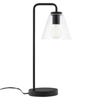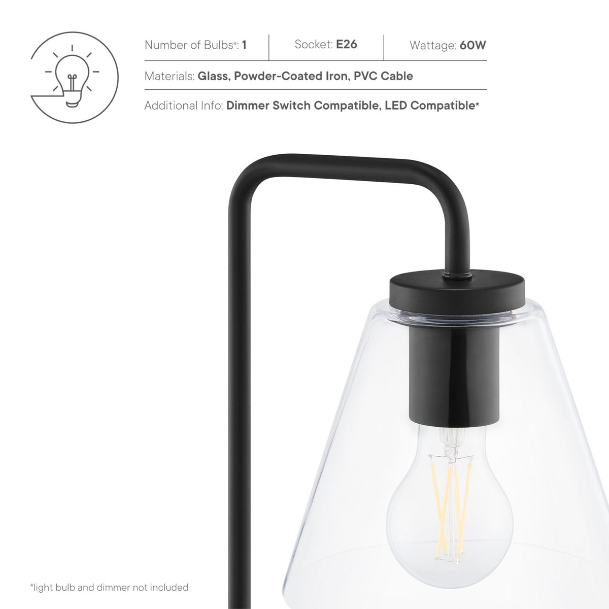The Element Glass Table Lamp accentuates your home decor in the living room, bedroom, office, or study room with its distinctive mid-century modern aesthetic. This side table lamp brings farmhouse appeal to mid-century modern, contemporary, rustic, or eclectic decors, boasting a classic transparent glass cone shade. An ideal desk lamp for the home office, Element is solidly constructed with a bent-pipe arm and a round iron base. This dimmable coffee table lamp is equipped with a black power cord and a convenient on/off switch. Requires 1 E26 60W max bulb or LED equivalent (not included). Compatible with dimmer switches (not included). Assembly required. Clean with a soft, damp cloth.Features:Material: Glass, metal, ironFinish: Black, clearTransparent glassBlack power cord with on/off switchBulbs: 1 E26 60W Max (Not Included)LED compatibleDimmable (switch not included)Clean with soft damp clothSpecifications:Product Dimensions: 20"H x 6.5"W x 9"DProduct Weight: 4 lbs